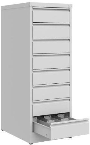 Wyposażenie:– stopki poziomujące pozwalające na wyrównanie szafy względem podłoża podwyższające szafkę o 10 mm– otwory do mocowania z elementami stałymi np. ściana budynku, drugi wyrób itp.– osiem szuflad przystosowanych na pięć rzędów o dopuszczalnym obciążeniu prowadnic do 69 kg– dwie przegrody ruchome typu „L”– plastikowe szyldziki ułatwiające opisanie zawartość szuflad– wieniec dolny z blachy czarnej– uchwyt drzwiowy z zamkiem zabezpieczającym w 2 pkt.Zgodność z normami:DIN EN 14073-2/11.04, DIN EN 14073-3/11.04, DIN EN 14074/11.04 Wymiary:– wysokość: 1285 mm– szerokość: 470 mm– głębokość: 630 mm Wykonanie:– korpus: blacha o gr. 0,8 mm– fronty szuflad: blacha o gr. 1,0 mm– pozostałe elementy: blacha o gr. 0,7 mm Szafy kartotekowe typu Szk to należą do najpopularniejszych i najchętniej kupowanych mebli biurowych. Szafkakartotekowa to podstawowy mebel każdego biura. Można je spotkać w urzędach, gabinetach lekarskich, wszędzie tam gdziemuszą być odpowiednio przechowywane dokumenty.Stosowana technologia przygotowania powierzchni blachy czarnej poprzez proces fosforanowania cyrkonowego ikonwersję cyrkonową zapewnia bardzo dobrą przyczepność dla farby oraz odpowiednie zabezpieczenie antykorozyjne.Zastosowane farby są zgodnie z Rozporządzeniem (WE) 1272/2008 (CLP) nie zostały sklasyfikowane jako stwarzającezagrożenie dla zdrowia. Maksymalny wymiar przechowywanego dokumentu 130x72 mm. Szafy aktualnie dostępne na magazynie są w kolorze RAL 7035. Pozostałe konfiguracje kolorów możliwe bez dopłaty - realizacja w ciągu 4-6 tygodni.