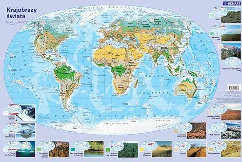 Mapa przedstawiająca krajobrazy świata wykonana w skali ok. 1 : 70 000 000 prezentuje najważniejsze zbiorowiska roślinne Ziemi wykazujące strefowość, czyli: wilgotne lasy równikowe, sawanny, pustynie gorące, stepy, lasy mieszane i liściaste, przeważnie iglastą tajgę, bezleśną tundrę, wreszcie lodowe pustynie Arktyki i Antarktyki. Są też formacje astrefowe związane z wysokimi górami i wielkimi rzekami. Wszystkie te – zdawałoby się skomplikowane wyróżnienia – są zilustrowane fotografiami i dodatkowymi mapami świata w niewielkiej skali, które ukazują zasięg danej formacji roślinnej. Już od piątej klasy szkoły podstawowej, uczniowie zapoznają się z tymi krajobrazami, a ta podkładka zdecydowanie pomoże im oswoić to zagadnienie. Użytkowe walory podkładki są jej kolejnym atutem: jest wykonana na gumowanej piance dobrze stabilizującej ją na biurku, na wierzchu pokrywa ją przezroczysta matowa folia – przyjemna w dotyku – po której nawet można pisać pisakiem i ścierać potem zapiski.