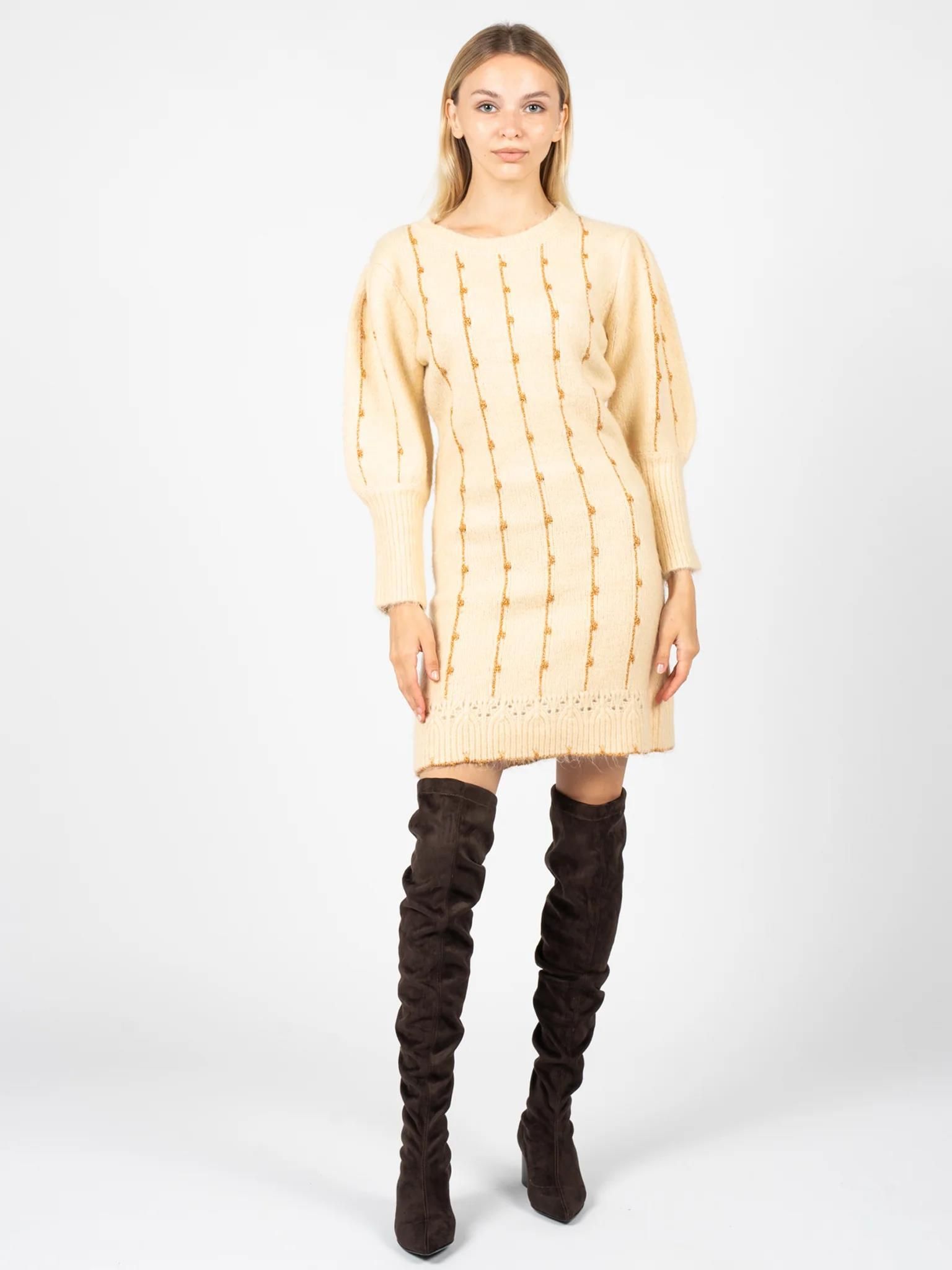 Dopasowany fason Długość midi, za kolano Ozdobiona złotą nitką Z delikatnymi pufkami na ramionach Rękaw 7/8 Rękawy oraz dół zakończone ściągaczem Wykonana z wysokiej jakości dzianiny