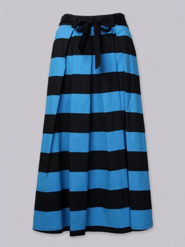 Spódnica rozkloszowana w czarne i niebieskie pasy z wysokim stanem, kieszeniami i materiałowym paskiem