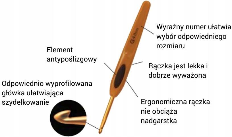 Szydełko Clover Soft Touch / rozmiar 6,0 mm / 1010 Szydełko znanej marki Clover z ergonomiczną rączką. Uchwyt jest tak wyprofilowany aby w czasie szydełkowania ręka się nie męczyła. • Całkowita długość szydełka: 13,5 cm • Rozmiar szydełka: 6,0 mm • Końcówka szydełka: 4 cm • Kolor złoty • Aluminium …
