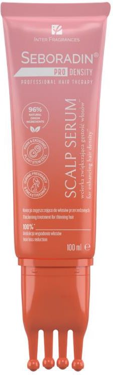 Wcierka do włosów Seboradin PRO DENSITY przeznaczona do codziennej pielęgnacji włosów słabych i przerzedzonych. Formuła z roślinnymi komórkami macierzystymi, bogatymi w PDRN i egzosomy, wspiera kondycję skóry głowy, pomaga ograniczyć wypadanie włosów i sprzyja ich optycznemu zagęszczeniu. Regularne stosowanie wzmacnia włosy, poprawia ich odporność na łamanie oraz zapewnia efekt odżywionych i nawilżonych pasm. 98% składników pochodzenia naturalnego. WSKAZANIA: Codzienna pielęgnacja dla większej gęstości włosów. Produkty mogą być stosowane przez kobiety od II trymestru ciąży i karmiące piersią. DZIAŁANIE I EFEKT: Wcierka do włosów Seboradin PRO DENSITY stworzona z myślą o włosach słabych i przerzedzonych. Formuła oparta na nowoczesnych składnikach aktywnych, w tym innowacyjnie pozyskiwanych roślinnych komórkach macierzystych, bogatych w PDRN i egzosomy. REDUKCJA WYPADANIA WŁOSÓW - 100%* Regularne stosowanie wcierki zapewnia optyczne zagęszczenie włosów.** Włosy stają się mocniejsze, mniej podatne na uszkodzenia i łamanie. Serum pomaga włosom zachować naturalną siłę i witalność. Pozostawia efekt odżywionych i nawilżonych włosów. 98% składników pochodzenia naturalnego. *Skuteczność działania potwierdzona w niezależnym laboratorium badawczym – test samooceny pod kontrolą dermatologiczną po 12 tygodniach regularnego stosowania. **Efektywność stosowania udowodniona w badaniach aparaturowych. SPOSÓB UŻYCIA: Aplikować przy użyciu kulkowego aplikatora, bezpośrednio na suchą lub umytą i osuszoną skórę głowy – między pasmami włosów. Delikatnie wmasować. Nie spłukiwać. Żelowa formuła zapewnia intensywne działanie i skoncentrowaną aplikację. W przypadku bardzo cienkich włosów zalecamy stosować na noc i rano w razie potrzeby umyć włosy. SKŁADNIKI: ekstrakt z esencji roślinnych komórek macierzystych, biotyna, bioflawonoidy, witamina B6 i B3 INGREDIENTS: Aqua, Alcohol Denat., PEG-40 Hydrogenated Castor Oil, Malus Domestica Fruit Cell Culture Extract, Bioflavonoids, Capryloyl Glycine, Niacinamide, Pyridoxine HCl, Biotin, Maltooligosyl Glucoside, Hydrogenated Starch Hydrolysate, Pentylene Glycol, Propylene Glycol, Glycerin, Lecithin, Xanthan Gum, Tocopherol, Alcohol, Parfum, Benzyl Salicylate, Hexamethylindanopyran, Hexyl Cinnamal, Tetramethyl Acetyloctahydronaphthalenes, Vanillin, Benzyl Alcohol, Ethylhexylglycerin, Phenoxyethanol, Citric Acid.