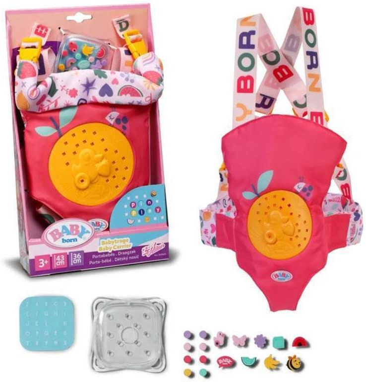 Nosidełko dla lalki. BABY born uwielbia spacery po parku. Zawsze jest tyle do odkrycia. Tam króliki skaczą po trawie, kaczki pływają w jeziorze, a ludzie wyprowadzają swoich pupili na spacer. Aby BABY born mogła sama obserwować, co się dzieje, lubi być przy swojej mamie w komfortowym nosidełku. System pasów nosidełka można dostosować do różnych rozmiarów dziecka. Charakterystyka produktu: różowe nosidełko dla lalki możliwość noszenia lalki przodem lub tyłem do "małej mamy" regulowane paski mocujące dla lalek o wymiarach 39-46 cm. pudełeczko z zapinkami do ozdabiania panelu z kaczuszką na froncie nosidełka rozszerza możliwości zabawy, pobudza wyobraźnię i wspiera kreatywne odgrywanie ról oraz rozwój umiejętności społecznych, w zestawie nie występuje lalka