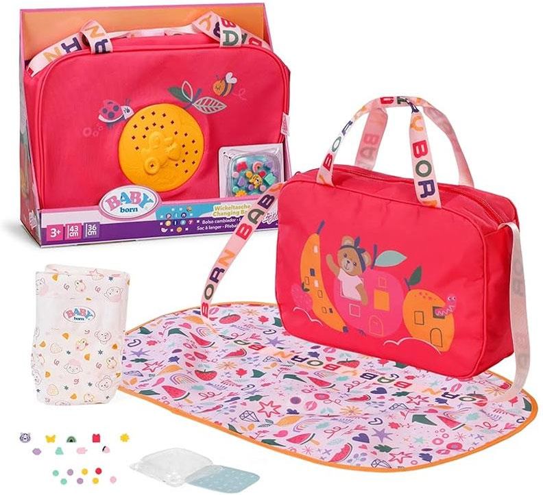 Unleash the nurturing spirit of your little ones with the delightful BABY born Changing Bag Pinplay. This enchanting accessory is a must-have for every young doll parent, designed to enhance imaginative play and provide endless hours of fun. Crafted with care and attention to detail, this changing bag is not just any ordinary accessory. It comes equipped with all the essentials needed to care for their beloved BABY born dolls. Inside, you'll find diapers, a powder box, and a handy storage box, ensuring that every doll is well taken care of, whether at home or on the go. What sets this changing bag apart is the opportunity for personalization. Included in the set are playful pins that children can use to decorate the bag, allowing them to express their unique style. The pins can be rearranged and reused, offering a fresh look every time and encouraging creativity and individuality. The adjustable straps ensure a comfortable fit for children of various sizes, making it easy for them to carry their doll's essentials wherever their adventures may lead. The included blanket adds an extra layer of care, perfect for keeping dolls cozy during playtime. Designed for children aged 3 years and up, this high-quality accessory is part of the beloved BABY born series, known for its commitment to fostering imaginative and varied play. The BABY born Changing Bag Pinplay not only complements the dolls but also enhances the overall play experience, encouraging nurturing skills and creativity. Whether your child is a seasoned doll parent or just beginning their journey into the world of imaginative play, this changing bag is the perfect companion. It's more than just an accessory; it's a gateway to a world of caring, creativity, and fun. Give your little one the gift of endless play possibilities with the BABY born Changing Bag Pinplay, and watch as they create cherished memories with their dolls, one playful moment at a time.