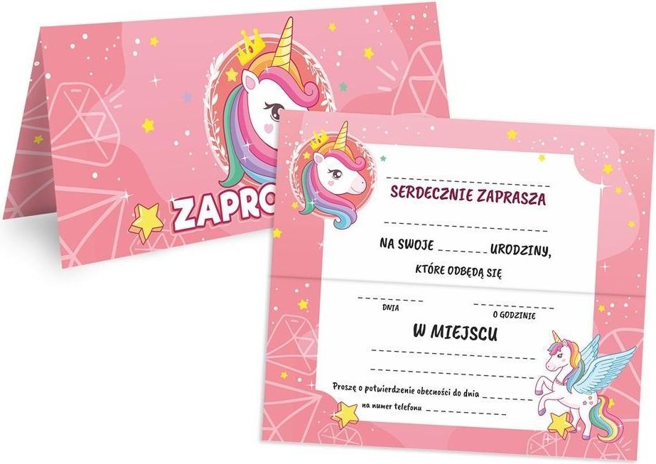 ZAPROSZENIE NA URODZINY - DWUSTRONNE - RÓŻOWY JEDNOROŻEC. Zaproszeni na urodzinki, które wywoła uśmiech na twarzy każdego dziecka. Zaproszenie z różowym motywem i pięknymi jednorożcami - idealna na urodziny dla dziewczynki. Kolorowy i wesoły sposób na zaproszenie gości na urodzinowe przyjęcie dla dziecka. Na zaproszeniu miejsce na wiek oraz imię solenizanta, imię zaproszonego, data, godzina i miejsce przyjęcia, a także wpis z miejscem na numer telefonu oraz termin do kiedy trzeba potwierdzić obecność. Mogą być też ogromną frajdą dla dziecka przy wypisywaniu zaproszeń razem z rodzicem lub rodzeństwem. Wydrukowane na wysokiej jakości grubym papierze, dwustronne i składane. Za dodatkową opłatą istnieje możliwość edytowania treści zaproszenia lub nadrukowania napisów. Zaproszenia są w rozmiarze: Rozłożone: ~ 17 cm x 15 cm Złożone: ~ 17 cm x 7,5 cm Format: 170x75 mm