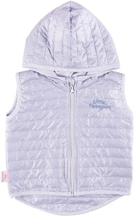 Kamizelka dziewczęca z kolekcji "Little Champion" uszyta z dwustronnej pikowanej tkaniny w pięknym szarym odcieniu. W kapturku znajduje się bawełniana podszewka. Kamizelka posiada praktyczny wydłużany tył. Elementem ozdobnym jest niewielki haft znajdujący się na przodzie. Krój umożliwia całkowite rozpięcie, przez co ubranko jest funkcjonalne i wygodne. Zamek przy szyjce zabezpieczony jest przed przycięciem. Wykończona miękkimi lamówkami. Wyprodukowana w Polsce. 100% poliester, podszewka 100% bawełna