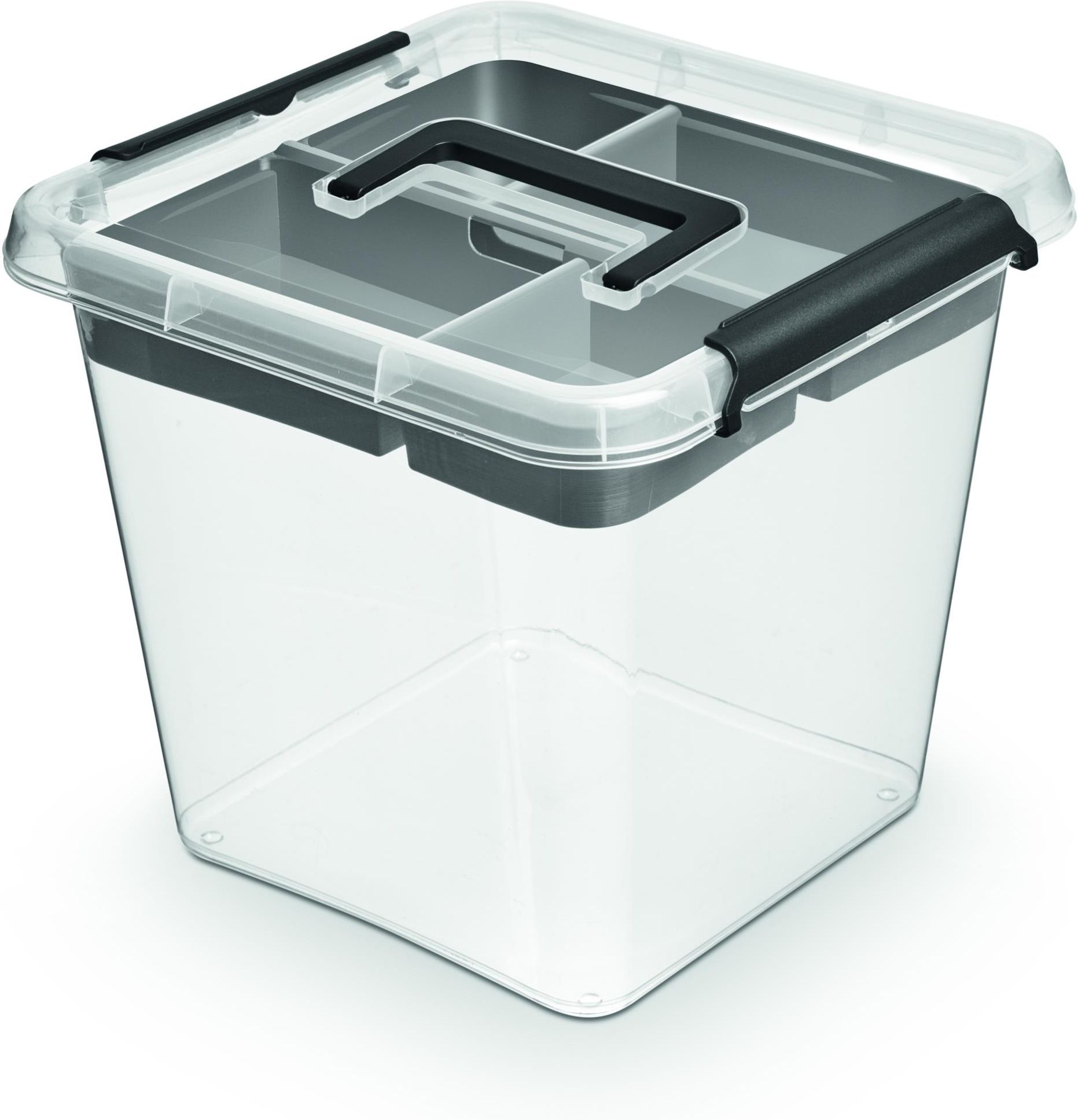 Plastikowy pojemnik na zabawki, do szafy, na bieliznę, na drobiazgi, pojemnik biurowy itp. Oferujemy wysokiej jakości pojemnik wykonany z transparentnego tworzywa sztucznego wyposażony we wkładkę, także wykonaną z tworzywa sztucznego, która w sposób znaczący poszerzy możliwości wykorzystania pojemnika. Pojemnik zamykany jest na dwa zatrzaski. Uchwyt w środkowej części pokrywy oraz wspomniane już zapięcie pozwalają na swobodne przenoszenie pojemnika. Wyjmowana wkładka może być wykorzystana jako osobny pojemnik do segregacji drobnych przedmiotów np. kredek, ołówków, gumek, nici, igieł, itp. Pojemnik nadaje się do kontaktu z żywnością, może być przechowywany w temperaturze od - 30 do + 90 stopni C, jest nietoksyczny, można go myć w zmywarkach. Wszystkie w/w cechy powodują, że może być on wykorzystywany np. w gastronomii, w pracy do przechowywania dokumentów, w domu do przechowywania włóczek, zabawek, narzędzi itp. Wymiary pojemnika: Szerokość: 30 cm Długość: 30 cm Wysokość: 27 cm Pojemność: 13 litrów Uwaga: zdjęcia z przedmiotami w pojemniku i we wkładce mają charakter poglądowy. Pojemnik z wkładką sprzedajemy bez tych przedmiotów.