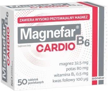 Biofarm Magnefar B6 Cardio 50tabletek Magnefar B6 Cardio to suplement diety przeznaczony dla osób dorosłych, który zawiera w swoim składzie potas, kwas foliowy, magnez i witaminę B6 dla uzupełnienia codziennej diety. Składniki suplementu diety Magnefar B6 Cardio pomagają w: utrzymaniu prawidłowego ciśnienia krwi (potas), utrzymaniu równowagi elektrolitowej (magnez), prawidłowym funkcjonowaniu układu nerwowego (magnez, potas, witamina B6), utrzymaniu prawidłowego metabolizmu homocysteiny (kwas foliowy). Składniki - Zawartość w 4 tabletkach Potas: 320 mg (%RWS* - 16) Magnez: 130 mg (%RWS* - 35) Witamina B6: 2 mg (%RWS* - 143) Kwas foliowy: 400 µg (%RWS* - 200) *%RWS – procent realizacji w stosunku do referencyjnej wartości spożycia Składniki Sole magnezowe kwasu cytrynowego, substancja wypełniająca – celuloza mikrokrystaliczna, cytrynian potasu, nośnik – poliwinylopolipirolidon, otoczka o składzie (substancja wypełniająca - węglan wapnia, substancja glazurująca - hydroksypropylometyloceluloza, stabilizator – glikol polietylenowy), substancja przeciwzbrylająca – sole magnezowe kwasów tłuszczowych, chlorowodorek pirydoksyny (witamina B6), kwas pteroilomonoglutaminowy (kwas foliowy). Dawkowanie Zalecane dzienne spożycie to: 2 tabletki rano i 2 tabletki wieczorem. Nie należy przekraczać zalecanej porcji do spożycia w ciągu dnia. Korzystne działanie produktu występuje przy spożyciu zalecanej dziennej porcji – 4 tabletek. Ważne informacje Nie przekraczać zalecanej porcji dziennej. Suplement diety nie może być stosowany jako substytut zróżnicowanej diety. Nie stosować w przypadku uczulenia na którykolwiek ze składników preparatu. Produkt jest przeciwskazany dla osób starszych, osób z chorobami nerek, z cukrzycą insulinoopornością, z nadciśnieniem tętniczym, z zaburzeniami rytmu serca. Kobiety w ciąży oraz matki karmiące piersią przed zastosowaniem suplementu powinny skonsultować się z lekarzem. Przechowywać w temperaturze pokojowej. Przechowywać w sposób niedostępny dla małych dzieci. Producent BIOFARM Sp. z o.o., ul. Wałbrzyska 13, 60 – 198 Poznań