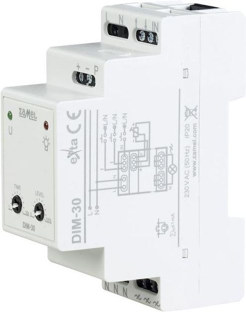 Ściemniacz DIM-30 ze względu na zastosowane rozwiązania sprzętowe oraz programowe umożliwia płynną regulację natężenia oświetlenia dla różnych źródeł światła. Współpracuje z konwencjonalnym oświetleniem żarowym i halogenowym 230 V AC, źródłami światła zasilanymi przez transformatory elektroniczne i toroidalne, wybranymi ściemnialnymi żarówkami LED oraz ściemnialnymi świetlówkami kompaktowymi CFL. Wybór typu obciążenia, nastawa minimalnego poziomu napięcia wyjściowego oraz czasów rozjaśniania/ściemniania ułatwia konfigurację i gwarantuje kompatybilność większą niż w przypadku stosowania typowych ściemniaczy oświetlenia. Do sterowania można wykorzystać podświetlane łączniki monostabilne (przyciski) pojedyncze oraz podwójne, potencjometry osprzętowe 1÷10 V oraz inne układy automatyki z wyjściami w standardzie 1÷10 V. Ściemniacz wykonany jest w wersji modułowej (obudowa 2-MOD) do montażu w rozdzielnicy (TH-35). Wyjście ściemniacza posiada zabezpieczenie zwarciowe, przeciążeniowe oraz termiczne co gwarantuje długą i niezawodną pracę. Główne cechy produktu: Płynna regulacja natężenia oświetlenia dla różnych źródeł światła regulowany czas rozjaśniania/ściemniania współpraca z osprzętowymi potencjometrami 1÷10 V sygnalizacja załączenia wyjścia (dioda czerwona) wybór typu obciążenia podłączonego do wyjścia ściemniacza współpraca z łącznikami monostabilnymi pojedynczymi i podwójnymi współpraca z układami automatyki w standardzie 1÷10 V regulowany minimalny poziom napięcia wyjściowego (minimalny poziom świecenia) wyzwalanie z linii L lub N sygnalizacja załączenia zasilania (dioda zielona)