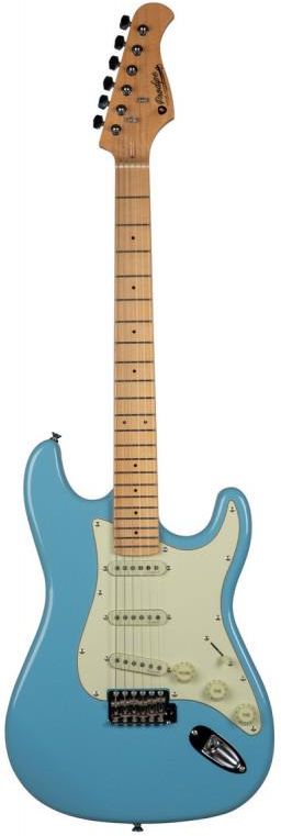 Prodipe Guitars ST80MA to gitara elektryczna typu Startocaster, która z powodzeniem łączy w sobie żywe, dynamiczne brzmienie z przystępną ceną i wysoką jakością wykonania. Dzięki zastosowaniu starannie wyselekcjonowanego drewna lipowego oraz klonu oferuje długą żywotność oraz odporność na uszkodzenia. Gitara elektryczna Prodipe Guitars ST80MA wyposażona została w trzy przetworniki single-coil oparte na magnesach Alnico, co przekłada się na bardzo uniwersalne brzmienie idealne zarówno do rocka, jak i nieco łagodniejszych gatunków. Chromowany osprzęt z mostkiem tremolo na czele zapewnia nienaganny strój oraz pełną kontrolę nad artykulacją. Idealna propozycja dla początkujących i średnio-zaawansowanych gitarzystów. Specyfikacja Prodipe Guitars ST80MA BL : Typ: Stratocaster Konstrukcja: Bolt-On Korpus: Lipa Gryf: Klon Podstrunnica: Klon Progi: 22 Klucze: Die-cast Osprzęt: Chrom Przetworniki: 3 x Alnico Single-coil Kontrola: Volume, 2 x Tone Mostek: Tremolo 5-pozycyjny przełącznik Pickguard: Biały Struny: Electric Hexagonal Explosion 9-46 Wykończenie: Połysk Kolor: Sonic Blue