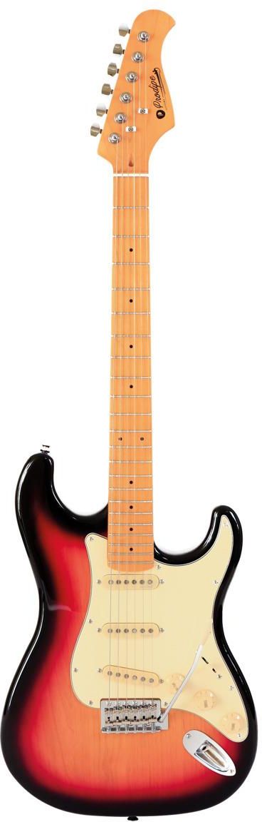 Prodipe Guitars ST80MA to gitara elektryczna typu Startocaster, która z powodzeniem łączy w sobie żywe, dynamiczne brzmienie z przystępną ceną i wysoką jakością wykonania. Dzięki zastosowaniu starannie wyselekcjonowanego drewna lipowego oraz klonu oferuje długą żywotność oraz odporność na uszkodzenia. Gitara elektryczna Prodipe Guitars ST80MA wyposażona została w trzy przetworniki single-coil oparte na magnesach Alnico, co przekłada się na bardzo uniwersalne brzmienie idealne zarówno do rocka, jak i nieco łagodniejszych gatunków. Chromowany osprzęt z mostkiem tremolo na czele zapewnia nienaganny strój oraz pełną kontrolę nad artykulacją. Idealna propozycja dla początkujących i średnio-zaawansowanych gitarzystów. Specyfikacja Prodipe Guitars ST80MA SB : Typ: Stratocaster Konstrukcja: Bolt-On Korpus: Lipa Gryf: Klon Podstrunnica: Klon Progi: 22 Klucze: Die-cast Osprzęt: Chrom Przetworniki: 3 x Alnico Single-coil Kontrola: Volume, 2 x Tone Mostek: Tremolo 5-pozycyjny przełącznik Pickguard: Biały Struny: Electric Hexagonal Explosion 9-46 Wykończenie: Połysk Kolor: Sunburst
