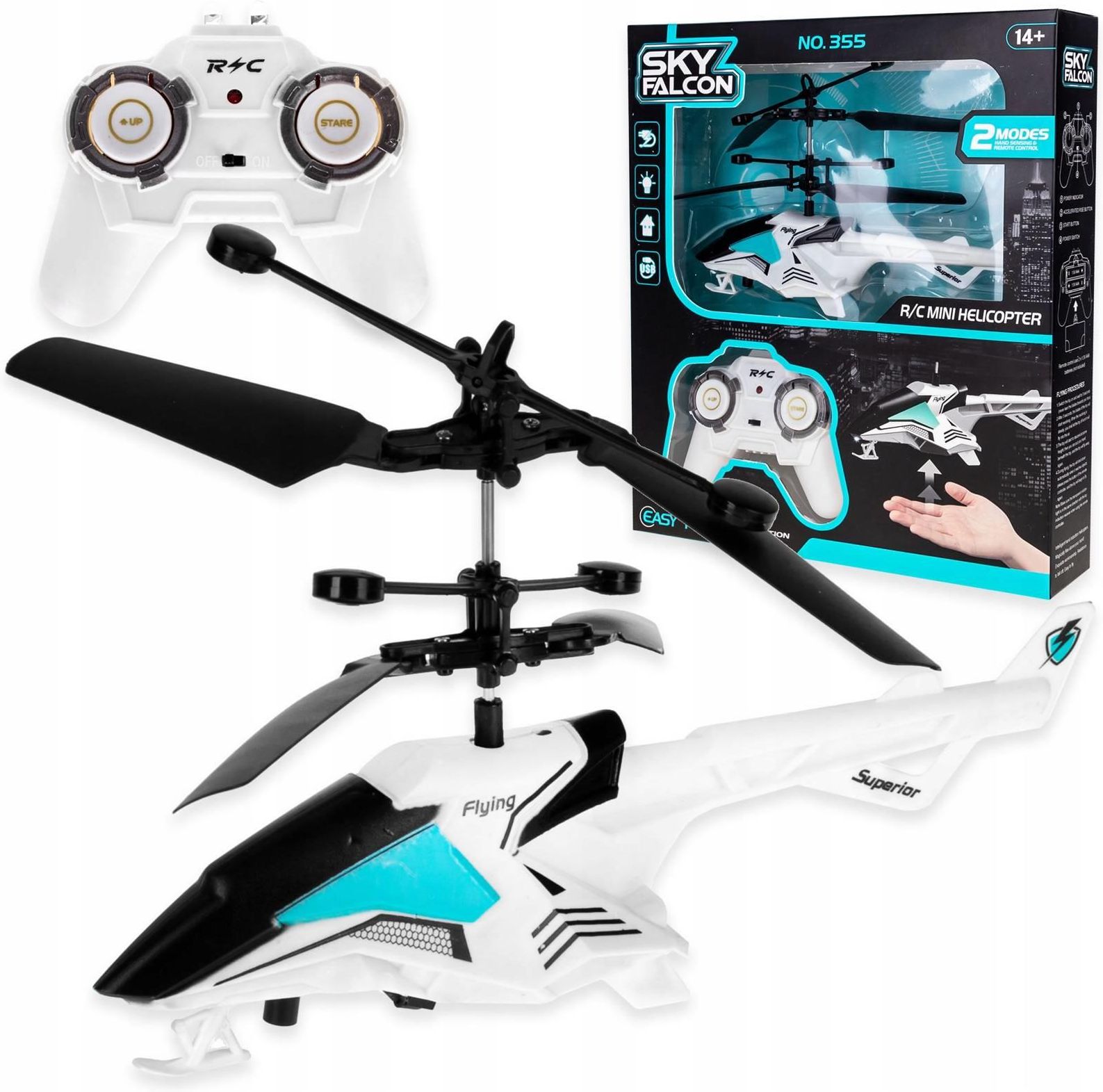 HELIKOPTER ZDALNIE STEROWANY RC NA PILOT + RĘKĄ 2w1 INDUKCYJNY LATAJĄCY LED Zdalnie sterowany indukcyjny helikopter Sky Falcon Helikopter przeniesie Cię na zupełnie nowy wymiar zabawy! Jesteś na to gotowy? Zabawka sterowana na dwa sposoby- pilotem oraz dłonią na zasadzie indukcji ! Charakterystyka Wysoka jakość wykonania Lekka konstrukcja Wbudowana dioda LED Dioda podczerwieni Nowoczesny design Wysoka jakość wykonania Helikopter został wykonany z najlepszej jakości materiałów. Wysokiej jakości tworzywo sztuczne sprawia że helikopter jest odporny na uszkodzenia. Natomiast dzięki lekkiej konstrukcji orazniewielkim wymiarom z łatwością unosi się w powietrzu. Zestaw idealny także dla początkujących! Lekka i wytrzymała konstrukcja, intuicyjny pilot oraz stabilność lotu to wszystko czego potrzebujesz aby zostać świetnym pilotem :) Elastyczna konstrukcja śmigła dla dodatkowej ochrony aby nie uległo ono złamaniu podczas ewentualnej kolizji. Dzięki temu śmigłowiec przetrwa naprawdę wiele lotów. Dodatkowo helikopter został wyposażony w diodę podczerwieni – steruj dłonią. Świetna zabawa, wiele możliwości ! Wbudowana dioda Model nadaje się również do zabawy w ciemnościach – posiada diodę z przodu kadłuba. Zabawa w takich warunkach dostarcza niezapomnianych wrażeń. Pilot zdalnego sterowania Kontrolę nad helikopterem sprawujesz za pomocą intuicyjnego bezprzewodowego nadajnika. Zasilany jest 2 bateriami AA (nie dołączonymi do zestawu). Czujnik podczerwieni Helikopter posiada wbudowany mini czujnik podczerwieni dzięki któremu może unosić się nad dłonią a Ty możesz go kontrolować bez konieczności użycia pilota! Ta funkcja pozwala także uniknąć gwałtownego zderzenia z podłożem. Produkt automatycznie wystartuje w 3 sekundy po uruchomieniu. Wbudowany akumulator Helikopter posiada wbudowany akumulator, który ładujemy za pomocą dołączonego kabla USB. Specyfikacja techniczna Wiek: 14+ Czujnik podczerwieni Materiał: wysokiej jakości tworzywo sztuczne Zasilanie helikoptera: wbudowany akumulator Zasilanie kontrolera: 2 x AA (nie dołączone) Wymiary : 17,5 x 11 cm Wymiary opakowania : 23,5 x 21 x 4,6 cm Waga: 132 g Certyfikat: CE Skład zestawu Helikopter Zdalnie sterowany pilot Kabel USB służący do ładowania Pudełko