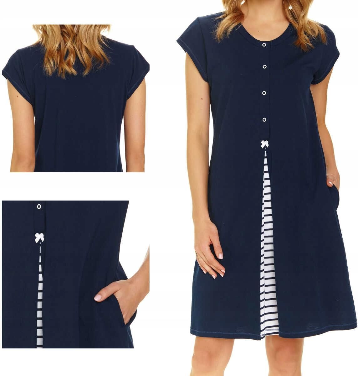 Koszula nocna TCB 9703 navy blue Kolor: Granatowy, Rozmiar: L Uniwersalny krój dla każdej kobiety. Nadaje się do noszenia nie tylko dla kobiet w ciąży ale również dla pań ceniących sobie swobodę. Urocza kontrafałda z przodu pozwoli dopasować koszulę do każdej figury. Rozpinana górna część koszuli umożliwia komfortowe karmienie dziecka Rozszerzany u dołu sprawia, że koszula dostosowuje się do rosnącego brzuszka Ponadczasowy krój, praktyczny w okresie ciąży i po porodzie Niezwykle miękki materiał który posiada właściwości higroskopijne i hipoalergiczne Koszulka wykonana w 100% z wysokojakościowej bawełny o certyfikatach: OEKO-TEX Standard 100 Skład: 100% Bawełna Cechy renomowany producent: Doctornap krótki rękaw długość: Przed kolano dekolt: okrągły wygodny i modny krój wysokiej jakości materiał Firma powstała w 1990 roku. Posiada w ofercie koszule nocne, piżamy, szlafroki, również dla kobiet w ciąży. Swoje wyroby firma produkuje w Polsce, głównie z wysokiej jakości bawełny, weluru oraz wiskozy. Misją firmy jest tworzenie bielizny nocnej idealnie odpowiadającej potrzebom ciała, dającej poczucie zmysłowego komfortu, a tym samym zaspokajającej nawet najbardziej wyrafinowane gusta. Kolekcje kierowane są do osób młodych i aktywnych, wrażliwych na aktualne trendy i ceniących sobie wygodę. Firma posiada również linię dla osób lubiących prostotę i elegancję. W zależności od ustawień monitora lub innego urządzenia wyświetlającego kolory mogą się różnić od oryginału. Wymiary w tabeli rozmiarowej sugerowane przez producenta.