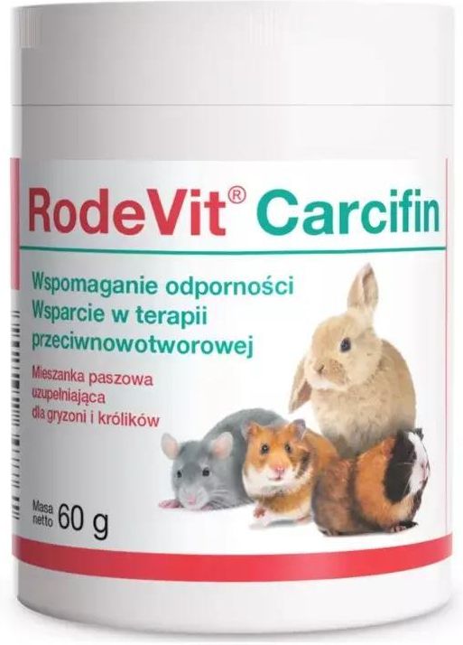 RodeVit Carcifin suplement wspiera terapię nowotworową 60g Właściwości RodeVit Carcifin jest kompozycją składników wspierających pracę układu odpornościowego, działających silnie przeciwutleniająco, wzmacniających kondycję i hamujących rozpad białek. Uzupełnienie diety składnikami preparatu stanowi cenną pomoc w trakcie walki z nowotworami. Instrukcja stosowania Króliki: 2-4 miarki (1-2g) dziennie z pokarmem Szczury, świnki morskie, chomiki i inne małe gryzonie: 1-2 miarki (0,5-1g) dziennie z pokarmem W razie potrzeby preparat można podać w formie papki za pomocą strzykawki lub łyżeczki. W tym celu należy zmieszać proszek z wodą w stosunku 1:2 (1 miarka proszku na 2 miarki wody) lub w większej ilości wody Skład: mąka lniana, drożdże piwne, sól wapniowa 3-hydroksy-3-metylomaślanu, sprzężony kwas linolowy, produkty przetwarzania roślin: ekstrakt z drzewa Sophora japonica, ekstrakt z pokrzywy zwyczajnej Urtica dioica, ekstrakt z mniszka lekarskiego Taraxacum offi cinale, ekstrakt z czarnuszki Nigella sativa, ekstrakt z dzikiej róży Rosa canina, ekstrakt z zielonej herbaty Camellia sinensis (teanina), ekstrakt z tymianku Thymus vulgaris, ekstrakt z jeżówki purpurowej Echinacea purpurea, ekstrakt z papryki Capsicum annuum (kapsaicyna), kwasy omega-3 i omega-6, fl awonoidy, polifenole Składniki analityczne: Białko surowe 21,2%, Oleje i tłuszcze surowe 4,2%, Włókno surowe 3%, Popiół surowy 1,8% Dodatki dietetyczne Witamina A 1 330 000 j.m., Witamina D3 132 000 j.m., Witamina E 12 000 mg, Witamina K 260 mg, Witamina C 40 000 mg, Cynk (hydroksychlorek cynku monohydrat) 2 000 mg, Selen (selenin sodu) 40 mg, Beta-1,3/1,6-glukan 72 500 mg/kg, HMB 60 000 mg/kg, Kwercetyna 45 000 mg/kg, CLA 32 000 mg/kg.