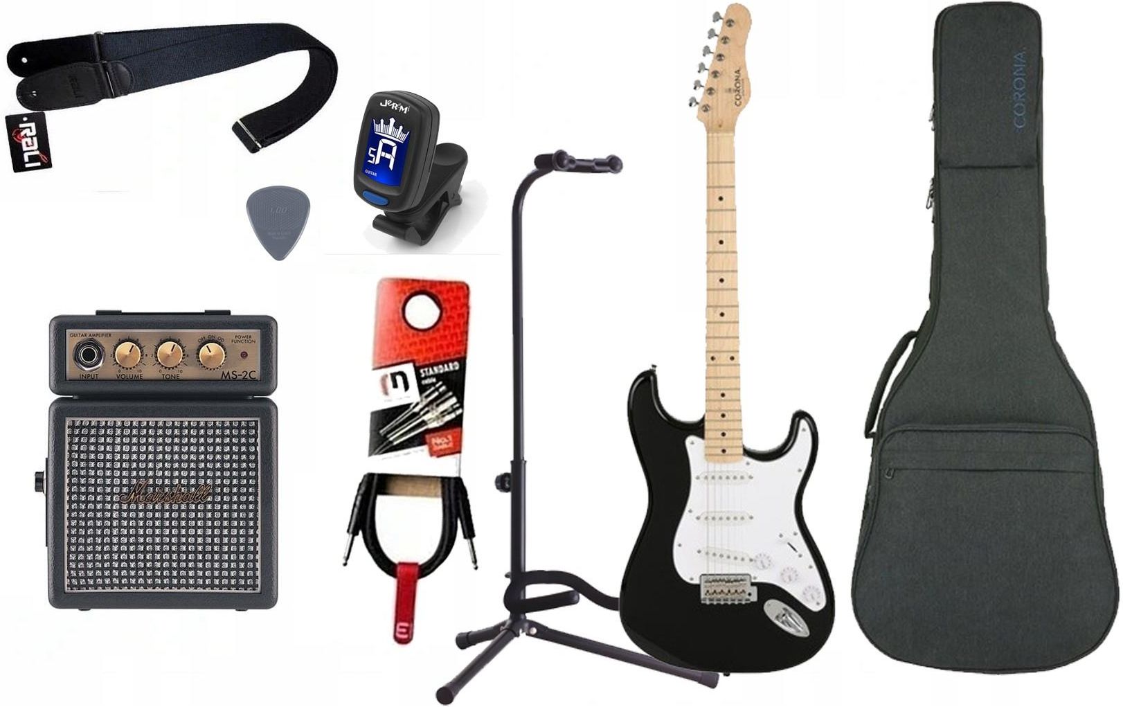 GITARA ELEKTRYCZNA + WZMACNIACZ 1 W KABEL ZESTAW Uwaga: Gitara w rozmiarze 3/4, dla młodszych graczy. Corona CLASSIC ST M-BLK Gitara elektryczna Corona Guitars. Model Classic ST to typowa gitara elektryczna typu Strat. Zapewnia bogate możliwości kreowania brzmienia oraz dużą wygodę gry. Wysokiej …