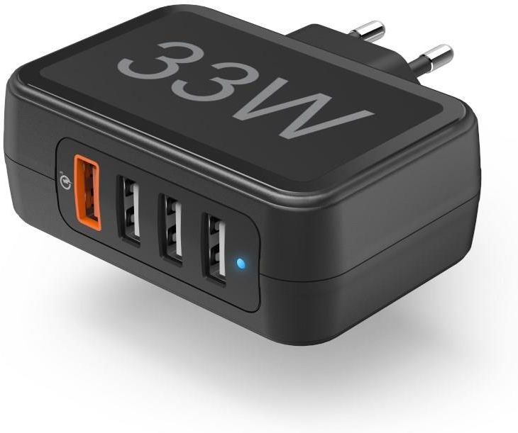 Hama ŁADOWARKA SIECIOWA 33W, 4-GNIAZDA (1xQC3.0, 3x USB-A) CZARNA Zasilanie i ładowanie do czterech urządzeń przez gniazdo, np. tabletu, smartfona lub Power Packa Praktyczna i wydajna stacja ładująca: idealna do jednoczesnego ładowania w domu lub w biurze Inteligentne i bezpieczne ładowanie: …
