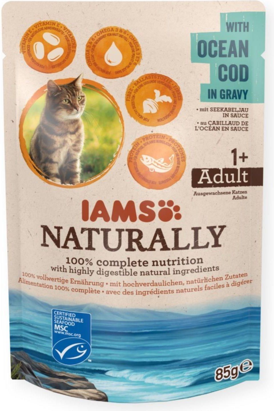 Linia karm mokrych IAMS Naturally to pełnoporcjowe produkty stworzone z wyselekcjonowanych i wysoce strawnych, naturalnych składników, tak aby wspierać zdrowie, siłę i witalność Twojego zwierzęcia. Wysoka strawność naturalnych składników  oznacza, że organizm kota wchłania składniki odżywcze z pokarmu, co pomaga mu utrzymać dobre samopoczucie i zdrowy wygląd. Witamina E  zawarta w produktach wspiera naturalną odporność kota. Aby utrzymać zdrową skórę i sierść, karma zawiera kwasy tłuszczowe Omega 3 i Omega 6. IAMS Naturally to także źródło włókna pokarmowego, które wspiera zdrowe trawienie oraz białka, które pomagają utrzymać silne, nieotłuszczone mięśnie. Skład: Mięso oraz produkty pochodzenia zwierzęcego, ryby i produkty pochodne z ryb (4% dorsz z certyfikatem MSC), produkty pochodzenia roślinnego, minerały, oleje i tłuszcze (0,1% olej rybny, 0,05% olej słonecznikowy) Wartości odżywcze: Białko 9.3%, Zawartość tłuszczu 5.1%, Popiół surowy 1.8%, Włókno surowe 0.4%, Wilgotność 79.3%, Witamina D3 250IU/kg, Witamina E (α-tocopherol) 150mg/kg Wskazówki odżywiania: Dorosłemu kotu podawaj od 2,5 do 3,5 saszetki na 4 kg masy ciała dziennie. Kot musi mieć zawsze dostęp do czystej i świeżej wody .  Przechodząc na IAMS Naturally, należy wprowadzać nową karmę stopniowo w ciągu 4 dni.