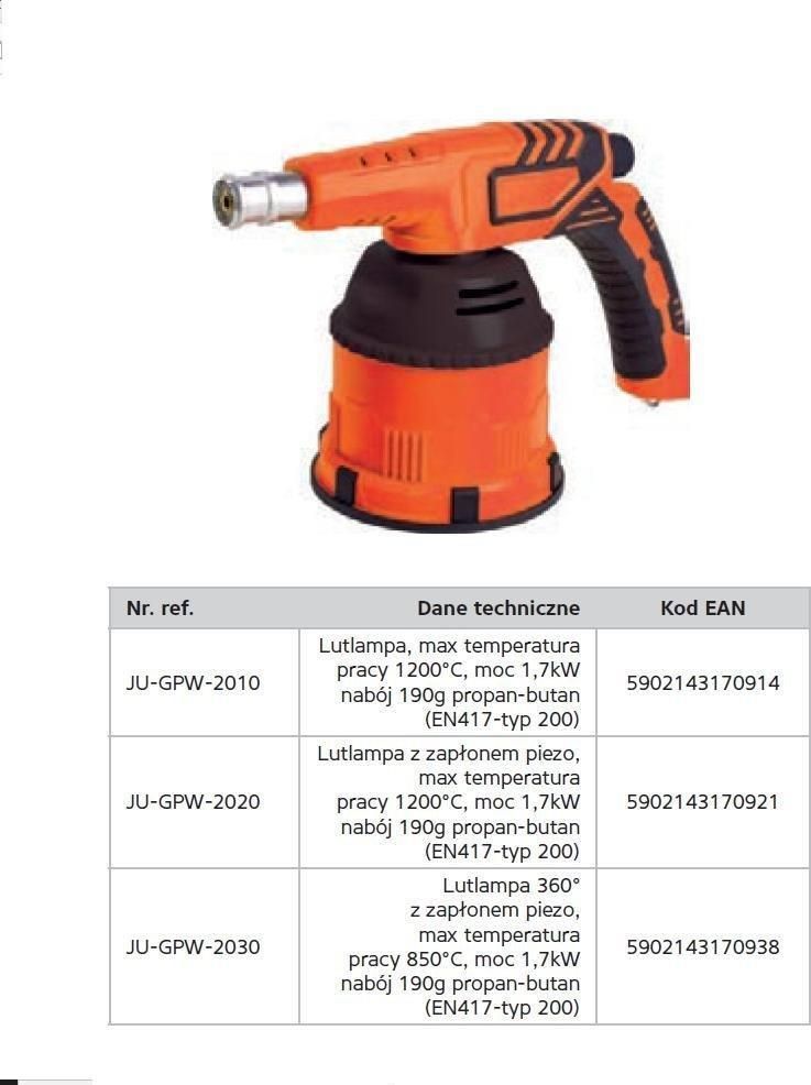 Lampa lutownicza (palnik) 'Jufisto GPW-2030 Waart' na naboje gazowe 190g 360° z zapłonem - do pracy w każdej pozycji Kod towaru: JU-GPW-2030 Marka: Jufisto Temperatura: 1200 °C Zużycie gazu na godzinę: 95 g Palnik: 0,25 mm Moc: 1,3 kW Mosiężna dysza Regulacja płomienia Wbudowany zapalnik piezzo Palnik gazowy przeznaczony jest do lutowania na cynę, aluminium, srebro, rozpalania (kominki, grille, kotły ), rozmrażanie, opalania np. usuwania lakierów, luzowania śrub, kształtowania, gięcia rur, płyt itp. Lutlampa posiada regulację płomienia.