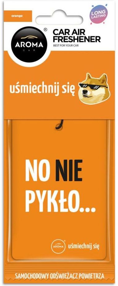 Zapach Samochodowy Aroma Orange – Lets Smile Aroma Orange to odświeżacz powietrza z serii Lets Smile, który łączy w sobie radosny przekaz i energetyzujący zapach. Celulozowa zawieszka nasączona płynną kompozycją zapachową uwalnia intensywną świeżość, tworząc przyjemną atmosferę w Twoim samochodzie. Świeży, orzeźwiający zapach – Wyrazisty zapach soczystej pomarańczy, który natychmiast odświeży wnętrze Twojego pojazdu. Długotrwała świeżość – Zapach uwalnia się w procesie odparowania, zapewniając świeżość przez długi czas. Łatwy w użyciu – Zawieszka jest prosta w montażu, wystarczy ją zawiesić na wewnętrznym lusterku, aby cieszyć się ulubionym zapachem. Humorystyczny design – Seria Lets Smile to odświeżacze o pięknych zapachach i pozytywnym, humorystycznym przekazie, który sprawi, że każda podróż stanie się przyjemniejsza. Zapach:Orange (Pomarańcza) – Orzeźwiający, naturalny zapach pomarańczy, który doda energii i świeżości w każdej podróży. Sposób użycia ✅ Wyciągnij zawieszkę z folii. ✅ Zawieś ją na wewnętrznym lusterku samochodu, aby cieszyć się ulubionym zapachem. ✅ Możliwość regulacji intensywności zapachu: Umieść zawieszkę w częściowo otwartej torebce foliowej, aby stopniowo uwalniać zapach. Zalety produktu ✅ Długotrwała świeżość: Zapach pomarańczy utrzymuje się przez długi czas. ✅ Regulacja intensywności: Możliwość stopniowego uwalniania zapachu. ✅ Łatwość użycia: Prosty i wygodny sposób aplikacji. ✅ Pozytywny akcent: Humorystyczny przekaz, który umili każdą podróż. Pojemność: Standardowa zawartość w formie zawieszki Zapach: Pomarańcza (Orange)