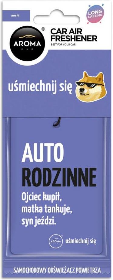 ZAPACH SAMOCHODOWY AUTO RODZINNE YOSHI ODŚWIEŻACZ Celulozowy odświeżacz powietrza w formie zawieszki nasączony płynną kompozycją zapachową. Zapach uwalniany jest w procesie odparowania. Absolutny bestseller wśród samochodowych odświeżaczy powietrza! Zapach YOSI to soczysty, słodki zapach zmieszany z innymi wesołymi, kolorowymi owocami jak gruszki, jabłka, śliwki, brzoskwinie, truskawki i maliny z lekkimi nutami kwiatowymi na piżmowej bazie. AUTO RODZINNE Ojciec kupił, matka tankuje, syn jeździ. Indeks: AROM072F Producent: Aroma Car Co cechuje nasz produkt? Wysoka jakość wykonania oraz niska cena wyróżnia nas na tle konkurencji. Możesz być pewny, że otrzymasz towar w pełni wartościowy. Opis technologii celulozowej Nośnik zapachu stanowi celuloza – silnie absorpcyjny materiał, świetnie wchłaniający kompozycje zapachowe. Zawieszka nasączona jest w 100% olejkami zapachowymi – przez co zapach nie ulega zniekształceniu, a produkt oddaje w całości oryginalny aromat skomponowanych olejków. Celuloza stanowi nośnik stały, dzięki czemu kompozycja nie wycieknie i, przy prawidłowym użytkowaniu, będzie bezpieczna dla samochodu. Sposób użycia Dzięki specjalnie zaprojektowanej folii barierowej, posiadającej mikrodziurki, możesz poznać wybraną aromatyzację przed jej rozpakowaniem. Wystarczy, że ją powąchasz. Wyciągnij zawieszkę z folii. Zawieś produkt na wewnętrznym lusterku samochodu i ciesz się wybranym zapachem. Można również stopniować uwalnianie i intensywność zapachu – wystarczy powiesić zawieszkę w częściowo otwartej torebce foliowej i stopniowo zsuwać torebkę.
