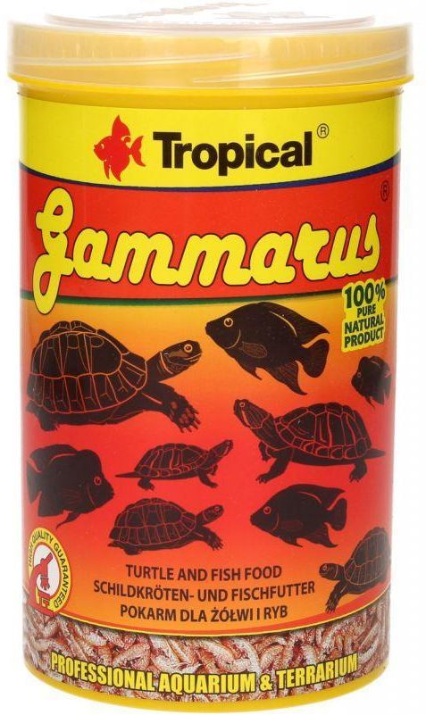 TROPICAL GAMMARUS SUSZONY KIEŁŻ ZDROJOWY 1000ML 120G GAMMARUS suszony kiełż zdrojowy. Kiełż zdrojowy (Gammarus pulex) to niewielki skorupiak (ok. 2-3 cm) z rzędu obunogów (Amphipoda). Kiełże stanowią istotny składnik diety ryb żyjących w środowisku naturalnym. Pokarm GAMMARUS to wygodne w użyciu suszone kiełże, które są źródłem mikro- i makroelementów oraz beta-karotenu – naturalnego barwnika z grupy karotenoidów. Beta-karoten intensyfikuje barwy ryb oraz pełni ważną rolę w wielu procesach fizjologicznych zwierząt, utrzymując je w doskonałej kondycji. Przede wszystkim jednak kiełże są źródłem chityny – substancji balastowej, która reguluje pracę przewodu pokarmowego, chroniąc zwierzęta przed groźnymi skutkami zaparć. GAMMARUS przeznaczony jest dla żółwi wodnych i lądowych oraz dużych gatunków ryb akwariowych i stawkowych. Wypróbuj również: Gammarus & Shrimps Mix