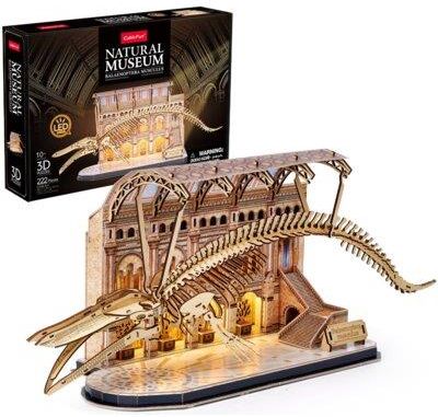 CUBIC FUN PUZZLE 3D ukazujące muzeum wraz z dużym szkieletem Płetwala Błękitnego podświetlonym światłem LED. W opakowaniu znajdują się 223 puzzle, wykonanych ze specjalnego materiału przypominającego piankę. Puzzle są ponumerowane, ponacinane i umieszczone na arkuszach. Wystarczy bez użycia siły wycisnąć element z arkusza i zmontować go zgodnie z dołączoną instrukcją, bez użycia kleju ani specjalnych narzędzi. Wielkość budowli po złożeniu to 58x20,5x37,5 cm.
