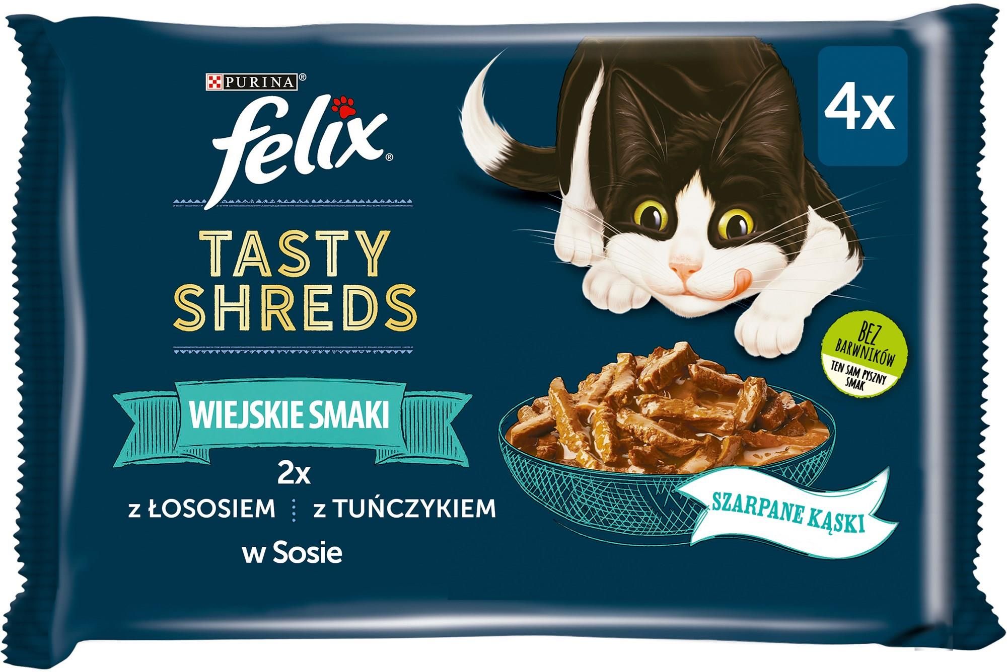 Felix Pouch Tasty Shreds Łosoś i Tuńczyk 4x80G Opis produktu Felix® Tasty Shreds to delikatne i niezwykle smakowite szarpane kąski w apetycznym sosie, które Twój kot pokocha! Każde danie zostało przygotowane w odpowiedniej temperaturze, a następnie poszatkowane na delikatne kąski i podane w niezwykle pysznym sosie. Skład Z ŁOSOSIEM Skład: mięso i produkty pochodzenia zwierzęcego* (16%), roślinne ekstrakty białkowe, ryby i produkty rybne (łosoś 4%), minerały, cukry, oleje i tłuszcze, produkty pochodzenia roślinnego. Kawałki: 50% mięsa i produktów pochodzenia zwierzęcego. Z TUŃCZYKIEM Skład: mięso i produkty pochodzenia zwierzęcego* (16%), roślinne ekstrakty białkowe, ryby i produkty rybne (tuńczyk 4%), oleje i tłuszcze, cukry, minerały, produkty pochodzenia roślinnego. Kawałki: 50% mięsa i produktów pochodzenia zwierzęcego. Składniki analityczne: Wilgotność: 78%, białko: 13.5%, tłuszcz surowy: 2.6%, popiół surowy: 2.6%, włókno surowe: 0.05%, kwasy tłuszczowe Omega-6: 0.5%. Zalecenia żywieniowe Zalecana Dzienna Porcja Dorosły kot (4 kg) = 4 x Felix Tasty Shreds 80g Przeciętnemu dorosłemu kotu, ważącemu ok. 4 kg, zaleca się podawanie 3 do 4 saszetek w ciągu dnia, w co najmniej 2 oddzielnych posiłkach. Podane normy ilości karmy dla kotów dorosłych odnoszą się do zwierząt umiarkowanie aktywnych w normalnej temperaturze otoczenia. Indywidualne potrzeby różnią się, a ilość podawanej karmy powinna zostać dostosowana tak, aby utrzymać prawidłową, szczupłą sylwetkę Twojego kota. Podawać w temperaturze pokojowej. Zwierzę powinno mieć stały dostęp do czystej, świeżej wody do picia.