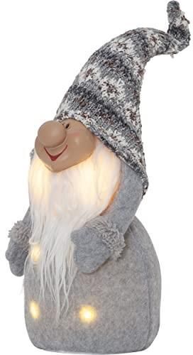 Dzięki temu dekoracyjnemu oświetleniu bożonarodzeniowemu LED skrzat z szarym płaszczem, czapką i rękawiczkami wciąga Cię w wesoły nastrój przed Bożym Narodzeniem Niezależnie od tego, czy na parapecie, stole, komodzie lub w pokoju dziecięcym – ta fantazyjna figurka bożonarodzeniowa zapewnia wszędzie przytulną atmosferę Bożego Narodzenia, a ponadto idealnie nadaje się jako prezent skrzaty Podświetlana dekoracja stołu jest wyposażona w 6 energooszczędnych diod LED (6 x 0,06 W) o żywotności 10 000 godzin, dzięki czemu jest wyjątkowo energooszczędna (strumień świetlny żarówki < 60 lm); Ciepłe białe światło tworzy przyjemną atmosferę i doskonale nastroi Cię na Boże Narodzenie Tę dekorację LED można łatwo włączyć i wyłączyć za pomocą przełącznika na obudowie z tworzywa sztucznego; do uruchomienia potrzebne są trzy baterie AA (nie wchodzą w zakres dostawy) Wymiary: wysokość: 40 cm, długość: 12 cm, szerokość: 12 cm