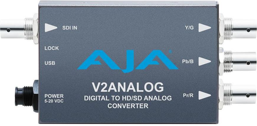AJA V2Digital Konwerter sygnałów do konwersji HD-SDI / SDI na FBAS / Y/C / component lub RGB. V2Analog to wysokiej jakości cyfrowo-analogowy konwerter, który jest idealnym rozwiązaniem do integracji urządzeń analogowych, takich jak monitory i magnetofony, z cyfrowym obiegiem pracy. V2Analog wykonuje wysokiej jakości konwersję cyfrowo-analogową SDI na komponenty lub kompozytową konwersję analogową w rozdzielczości SD lub HD z pełną 10-bitową ścieżką danych. V2Analog pobiera przychodzące sygnały SDI i konwertuje je na wyjścia komponentowe YPbPr (SMPTE, EBU-N10), Betacam lub RGB lub wyjścia kompozytowe NTSC/PAL lub Y/C (S-Video) w celu pełnej integracji z dowolnym przepływem pracy. Konfiguracja może być ustawiana za pomocą mikroprzełączników w urządzeniu lub zdalnie za pomocą oprogramowania AJA MiniConfig przez USB. Specyfikacja: Formaty wideo - (HD) 1080i 50, 59.94, 60(HD) 1080p 23.98, 24, 25, 29.97, 30(HD) 1080PsF 23.98, 24, 25(HD) 720p 50, 59.94, 60(SD) 625i(SD) 525i WejściaHD/SD-SDI, SMPTE-259/292/296M, 1x BNC WyjściaHD component YPbPr, RGB (SMPTE-274), BNCSD component (Betacam, EBU-N10)/composite/YC (S-Video), BNC SterowaniePrzełącznik zewnętrznyControl (lokalne/zdalne)Component/Composite (tylko SD)Format (YPbPr/YC lub RGB)Pedestal Present (włączony/wyłączony) (tylko SD) Wymiary - 129.54 × 60.96 × 25.4 mm Zasilanie - +5-20 VDC, 3 waty ŚrodowiskoBezpieczna temperatura pracy: 0 do 40 CBezpieczna temperatura przechowywania (zasilanie wyłączone): -40 do 60 CWilgotność względna podczas pracy: 10-90% bez kondensacjiWysokość operacyjna: