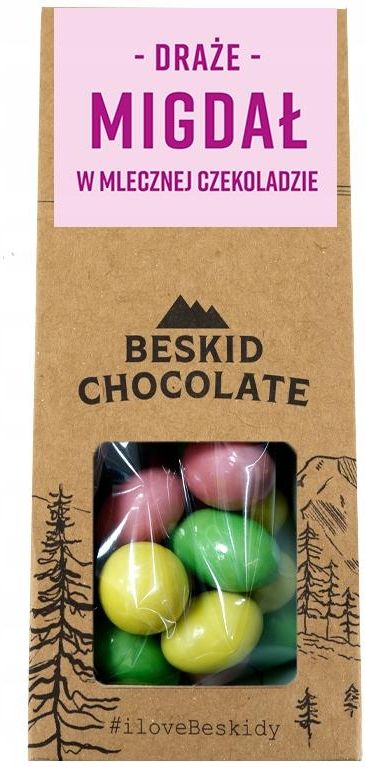 Beskid Chocolate to manufaktura czekolady, która znajduje się w urokliwej miejscowości Węgierska Górka w Beskidzie Żywieckim na południu Polski. Od nazwy pasm górskich górskich Beskidy otaczających miejscowość zaczerpnęliśmy naszą nazwę, która podkreśla pochodzenie naszych tabliczek. Beskid Chocolate to rzemieślnicze czekolady od ziarna do tabliczki, które produkujemy z wysokiej jakości ziaren kakaowca z całego świata. Rafinowane i konszowane min. 48 godzin. Nasze czekolady wytwarzamy z wysoko gatunkowych, aromatycznych odmian ziaren kakaowca. Część ziaren używanych do produkcji naszych tabliczek pochodzi z gospodarstw z certyfikatem ekologicznym. Migdał w mlecznej czekoladzie 50g Migdały w mlecznej czekoladzie to wspaniały produkt, który bez wątpienia przyciągnie uwagę miłośników słodyczy. Migdały są starannie wyselekcjonowane i oczyszczone, a następnie zanurzone w gęstej i kremowej mlecznej czekoladzie. Słodki smak czekolady w połączeniu z chrupiącymi migdałami tworzy idealne połączenie smakowe, którego każdy będzie chciał spróbować. To produkt, który idealnie nadaje się na prezent lub jako dodatek do koszyka wielkanocnego. Migdały w mlecznej czekoladzie to również doskonały sposób, aby zaoferować swoim gościom coś wyjątkowego i smacznego podczas świątecznego przyjęcia. Produkt jest stylizowany na wielkanocne pisanki, co dodaje mu uroku i przyciąga uwagę. Nasze migdały w mlecznej czekoladzie są produkowane z najwyższej jakości składników, dzięki czemu zachowują świeżość i intensywny smak. To doskonały produkt dla osób, które lubią słodkie przekąski i poszukują czegoś wyjątkowego na Wielkanoc. Spróbuj już dziś i przekonaj się sam! Skład: Czekolada mleczna: masa kakaowa min. 40% (cukier, ziarno kakaowca, mleko pełne w proszku, masło kakaowe, emulgator: lecytyna sojowa), migdał (30%), barwnik: E100, E120, E133, polewa cukrowa 0,05% (syrop glukozowy, E414, masło shea, E330, E202) Masa netto: 50g