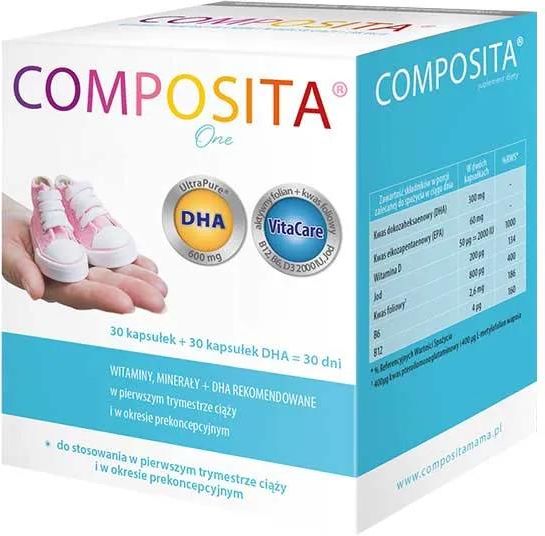 Wysoko standaryzowany DHA  z 5 gwiazdkami IFOS aż 300mg! Kwasy DHA są kluczowe dla: rozwój układu nerwowego dziecka prawidłowego rozwoju poznawczego i ostrości widzenia noworodków zapobiegania nadciśnieniu indukowanego ciążą obniżenia ryzyka wystąpienia porodu przedwczesnego Co jeszcze znajduje się w Composita One®? Wysoka zawartość folianów Składniki w aktywnych i wysoko biodostępnych formach Rekomendowane przez PTGiP składniki .lnd_compo01 { max-width: 75%; margin: 0 auto; background: #c4d4dd; border: 1px solid #d6c5d0; padding: 10px 50px; border-radius: 99px 0px 0px 99px; color: #fff; } .lnd_composita01 { color: #FFF; background: #c4d4dd; border: 1px solid #d6c5d0; max-width: 90%; min-height: 500px;; margin: 0 auto; padding: 35px; border-radius: 0px 0px 99px 99px ; }