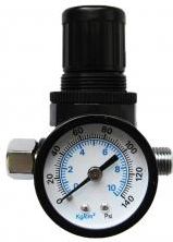 Reduktor, manometr pod narzędzia pneumatyczne i pistolety lakiernicze. Zadaniem reduktora jest utrzymanie stałego ciśnienia na wyjściu, w odróżnieniu od regulatorów, które tylko tłumią przepływ.Regulacja odbywa się za pomocą pokrętła, które ustawia membranę na dane ciśnienie niezależnie od ciśnienia wejściowego (musi być większe od ciśnienia wyjściowego) lub zmiennej wartości natężenia przepływu powietrza. DANE TECHNICZNE: przyłącze [cal]: 1/4" W/Z zakres regulacji ciśnienia [bar]: 0-10 maksymalne ciśnienie wejściowe [bar]: 10