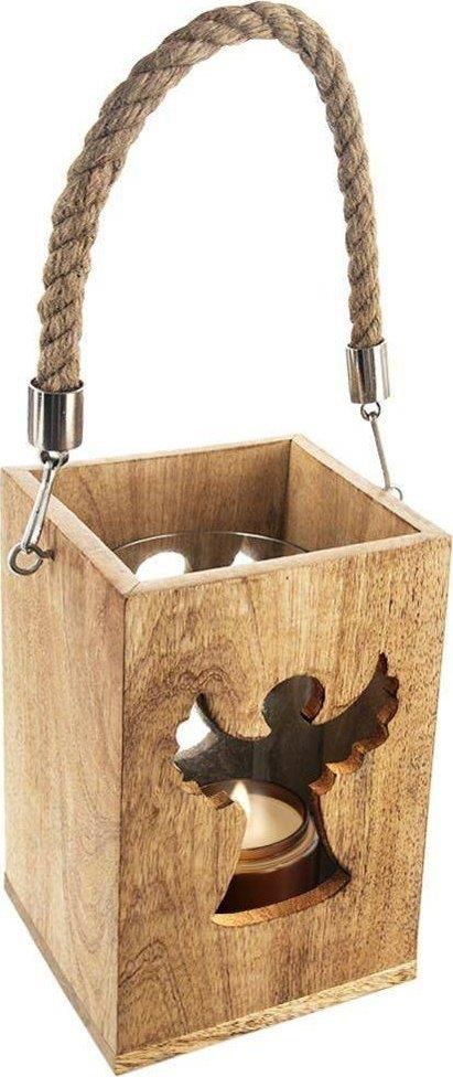 Lampion na świeczkę drewniany ze szklanym wkładem anioł 14x20,5 cm UNIWERSALNY - Lampion z aniołem na tradycyjne świece lub świeczki typu tealight. Posiada szklany wkład o wymiarach 10 x 16 cm. Lampion ma wymiary: 14 x 14 x 20,5 cm. Przeznaczony do powieszenia lub postawienia. DREWNIANY - Lampion …