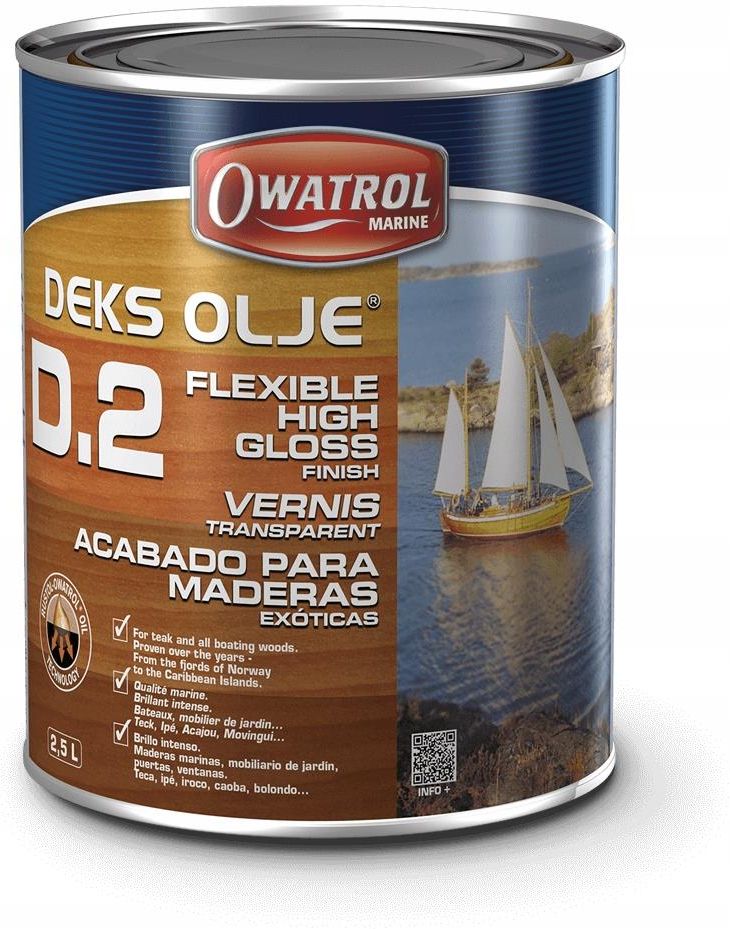 OWATROL OLEJ D2 – LAKIER WYKAŃCZAJĄCY DO DREWNA 2,5L Owatrol D2 - Profesjonalny Olej Wykańczający do Drewna Owatrol D2 to wysokiej jakości olej wykańczający, zaprojektowany specjalnie do drewna bardzo trwałego, egzotycznego oraz miękkiego. Ten produkt tworzy elastyczną, szklistą powłokę ochronną na powierzchni drewna, przypominającą lakier. Zabezpiecza drewno przed szkodliwym działaniem czynników mechanicznych, środowiska oraz promieniowania UV. Właściwości Elastyczna Powłoka Ochronna: Tworzy elastyczną, szklistą powłokę, chroniącą drewno przed uszkodzeniami mechanicznymi. Ochrona Przed Czynnikami Zewnętrznymi: Skutecznie zabezpiecza przed szkodliwym działaniem środowiska i promieniowania UV. Stabilizacja Struktury Drewna: Stabilizuje strukturę drewna, zapobiegając pęknięciom. Trwała Ochrona: Bardzo trwała ochrona, nie łuszczy się, nie pęka, nie odparza się. Możliwość Punktowego Odnawiania: Zniszczone powłoki można odnawiać punktowo bez konieczności cyklinowania. Zastosowanie Na Zewnątrz: Balustrady, meble ogrodowe, poszycia łodzi, itp. Wewnątrz Budynków: Boazeria, stolarka okienna i drzwiowa, itp. Dla Różnych Gatunków Drewna: Do drewna iglastego, liściastego, egzotycznego i modyfikowanego termicznie. Dla Różnych Powierzchni: Do powierzchni poziomych i pionowych. Aplikacja Przygotowanie Powierzchni: Drewniana powierzchnia przed aplikacją powinna być czysta i sucha. Nanoszenie Oleju: Nanieść jedną warstwę Owatrol D2. Czas Penetracji: Pozostawić na czas penetracji około 12 godzin. Nanoszenie Wielowarstwowe: Nie wymaga matowienia pomiędzy kolejnymi warstwami. Stosować nanoszenie wielowarstwowe. Schnięcie: Czas schnięcia między warstwami wynosi od 12 do 24 godzin; pełne użytkowanie po 3 dobach. Dane Techniczne Wydajność: 1l na 15m² Dostępne Opakowania: 2,5 L Aplikacja: Pędzel lub wałek Temperatura Aplikacji: Od +8°C do +35°C Czas Schnięcia: Od 12h do 24h między warstwami; pełne użytkowanie po 3 dobach Czyszczenie Narzędzi: Benzyna lakowa Wymaga Olejowania Podkładowego: Olejowania podkładowego (D1, TEXTROL) lub XYLIN – wewnątrz. Gabaryt: B Długość (GABARYT): 15 Wysokość (GABARYT): 20 Szerokość (GABARYT): 15 Waga gabarytowa w gramach: 750