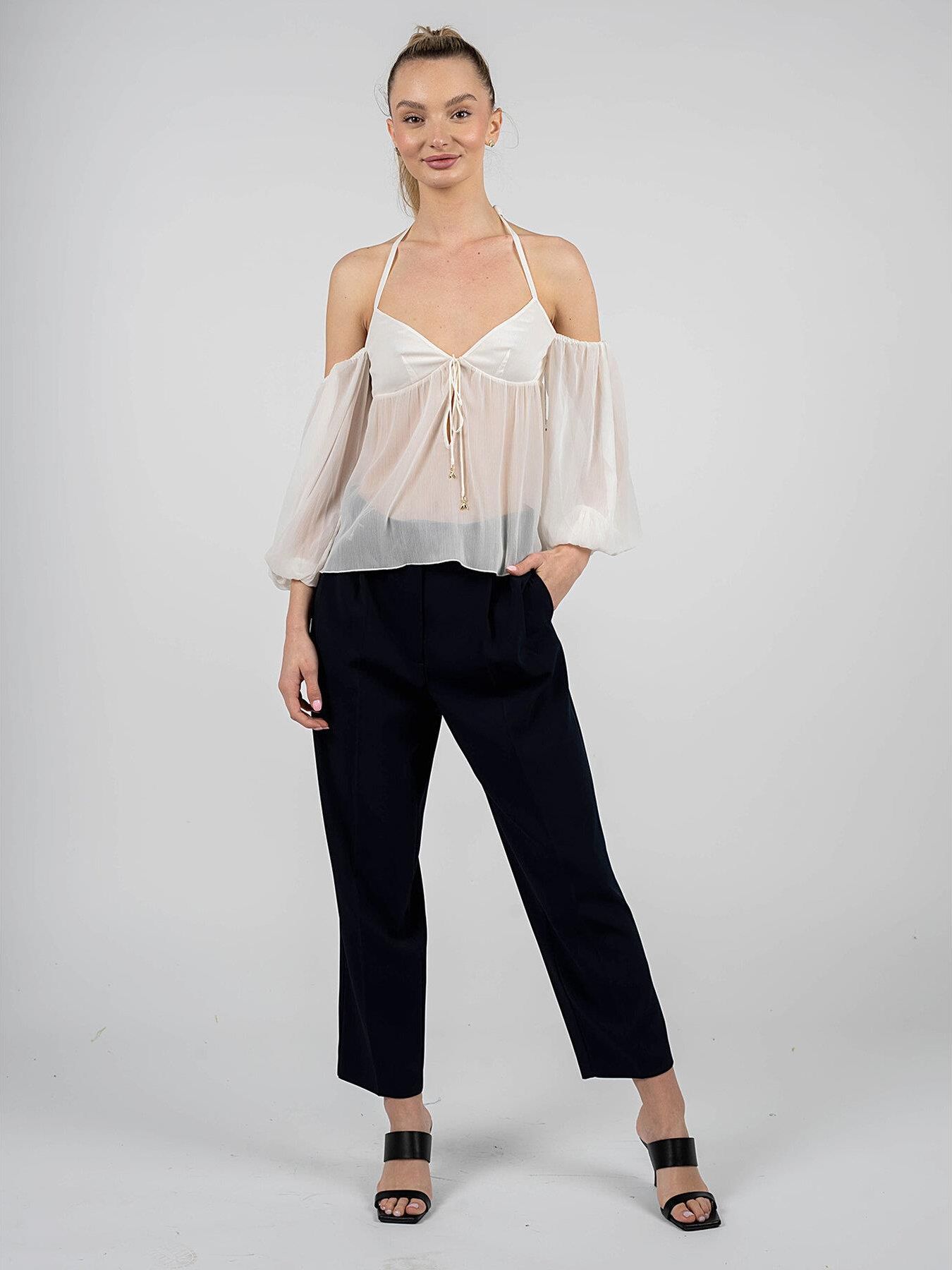 Prosty fason Nogawki długości 7/8 Średni stan Zapinane na zamek błyskawiczny, sygnowany guzik i haftkę Góra z zaszewkami Nogawki w kant Z tyłu kieszeń z zapięciem na guzik Wykonane z wysokiej jakości tkaniny z domieszką streczu