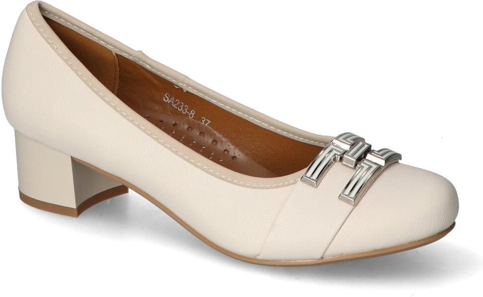 Eleganckie czółenka marki M. Daszyński:- wykonane z wysokiej jakości skóry ekologicznej - wnętrze pokryte zostało skórą ekologiczną - wkładka wewnętrzna wykonana ze skóry naturalnej aby zapewnić komfort podczas użytkowania- obcas o wys. 4,5 cm zapewni odpowiednią stabilizację - biały kolor i modny fason tworzą idealne połączenie!