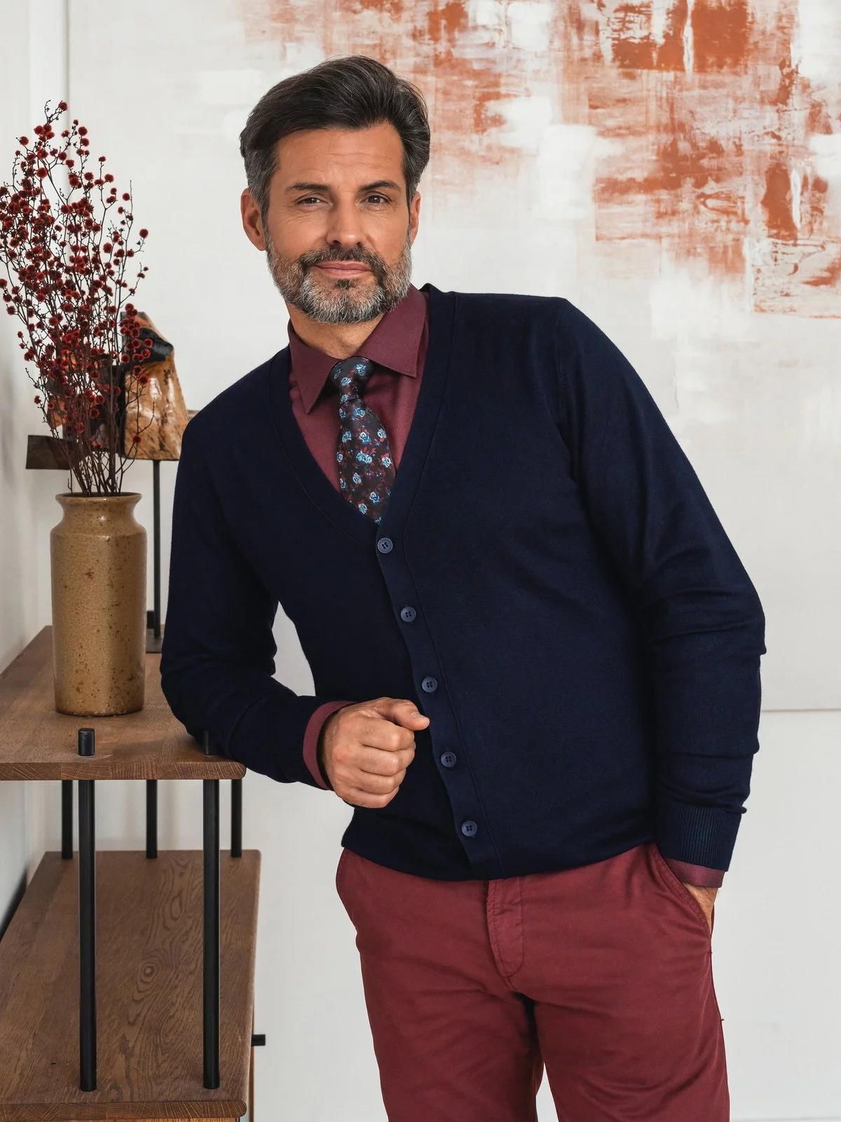 Kardigan męski Willsoor Kolor: ciemnogranatowy Typ: rozpinany na guziki (kardigan) Skład: 70% wiskoza, 30% nylon Gwarancja: 24 m-ce Uszyty w Polsce