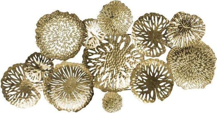 Dekoracja Ścienna Dekoracje metalowe będące produktami z metaloplastyki to nie tylko elementy ozdobne, ale również funkcjonalne detale wyposażenia do każdego wnętrza w stylu klasycznym, rustykalnym, czy nowoczesnym. Stylowe wykonanie dekoracji z metalu oraz rozmaitość ich wzorów i fasonów sprawia, że świetnie się one sprawdzą w dowolnym pomieszczeniu bez względu na ich przeznaczenie. Będzie oryginalną ozdobą każdego pomieszczenia, w którym się znajdzie. Dekoracja wykonana z metalu w złotym kolorze. Opis - rozmiar: 65 x 120 x 5cm (wys. x szer. x gł.) - kolor: złoty - montaż: nie wymaga, dekoracja dostarczana w całości - posiada uchwyty do zamocowania - materiał wykonania: metal Kolekcja dekoracji w różnych odcieniach i kształtach to idealny wybór dla miłośników elegancji i designu z najwyższej półki. Różnorodność kolekcji pozwala na łączenie ze sobą elementów na wiele sposobów oraz nadanie wnętrzom indywidualnego charakteru.