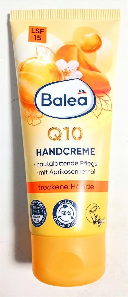 Balea Krem do rąk Q10 SPF15 olejek morelowy 100 ml Balea Krem do rąk Q10 SPF15 z olejkiem morelowym to doskonałe rozwiązanie dla Twoich dłoni. Ten krem nie tylko skutecznie nawilża skórę, ale także zapewnia rozpieszczającą pielęgnację. Jego delikatna formuła pielęgnacyjna ma świeży, owocowy zapach moreli, który sprawia, że korzystanie z niego jest prawdziwą przyjemnością. Formuła tego kremu została wzbogacona o Q10 oraz ochronę przeciwsłoneczną SPF15. Q10 pomaga wzmocnić i odżywić skórę dłoni, zapewniając jej elastyczność i młodszy wygląd. Dodatkowo, filtr SPF15 chroni skórę przed szkodliwym promieniowaniem UV, co jest istotne dla ochrony przed przedwczesnym starzeniem. Dodaj odrobinę luksusu do codziennej pielęgnacji dłoni. Wypróbuj Balea Krem do rąk Q10 SPF15 z olejkiem morelowym i poczuj, jak Twoje dłonie są pielęgnowane i chronione. Ciesz się owocowym zapachem moreli i promiennym wyglądem skóry. Wybierz krem, który pielęgnuje Twoje dłonie bez obciążania środowiska.