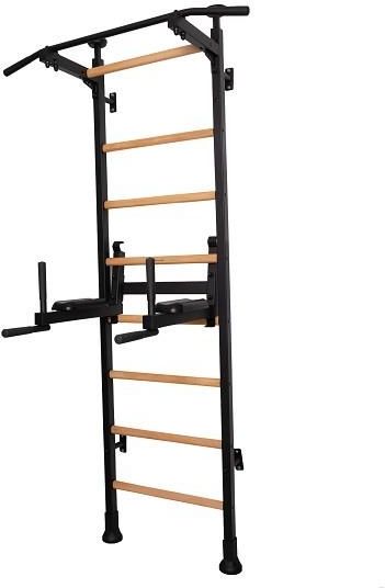 Naścienna drabinka gimnastyczna BenchK 512 W zestawie: drabinka BenchK 511 (8 drewnianych szczebli 30 × 40 mm, 2 pionowe profile metalowe 50 mm x 40 mm); poręcze do ćwiczeń (dip bar) BenchK DB 510 z podłokietnikami z pianki poliuretanowej z uchwytami pod sztangę (maksymalna waga sztangi 200 kg); …
