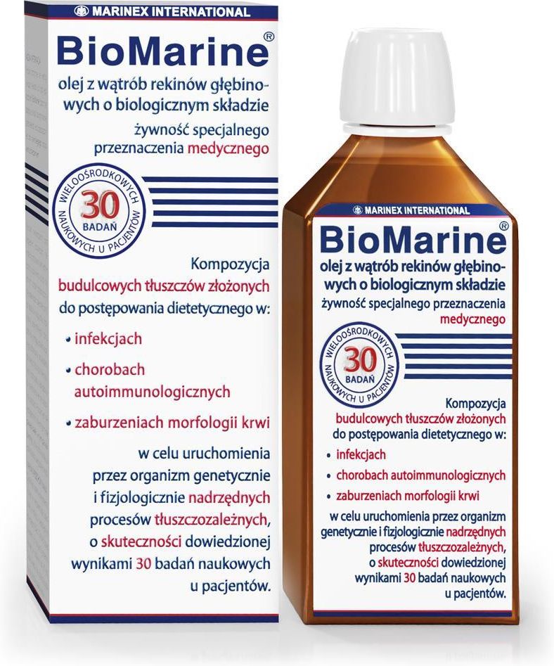 Żywność specjalnego przeznaczenia medycznego BioMarine naturalny olej z wątroby rekinów głębinowycho biologicznym składzie, 100 ml BioMarine® – żywność specjalnego przeznaczenia medycznego (żspm) została zastosowana w 30 wieloośrodkowych i wielokierunkowych badaniach naukowych, przeprowadzonych u pacjentów leczonych z powodu: ciężkich i nawracających infekcji, chorób autoimmunologicznych m. in.: RZS, łuszczycy, AZS, SM i zaburzeń morfologii krwi. Zastosowanie BioMarine® (żspm) jest unikalnym źródłem naturalnej kompozycji głównie tłuszczów złożonych: alkilogliceroli i skwalenu oraz wyższych nienasyconych kwasów tłuszczowych: NA - kwas nerwonowy, substancji budulcowych niezbędnych Organizmowi Człowieka do uzyskania genetyczno-fizjologicznej budowy i działania: układu odpornościowego układu krwiotwórczego układu limfatycznego skóry Tłuszcze (% suchej masy) Szpik kostny czerwony 65,8 Mózg (istota biała) 57,5 Serce 34,5 Skóra 32,6 Mleko matki 31,9 Wątroba 28, Wskazania W czasie zaburzeń i chorób zapotrzebowanie Organizmu Człowieka na ten rodzaj tłuszczów znacząco wzrasta, dlatego, jak wykazało 30 wieloośrodkowych i wielokierunkowych badań naukowych przeprowadzonych u pacjentów, BioMarine® (żspm) przeznaczony jest do postępowania dietetycznego tłuszczami złożonymi, równolegle z leczeniem: ciężkich i nawracających infekcji bakteryjnych, wirusowych, grzybiczych i mieszanych, autoimmunologicznych chorób tarczycy (np. choroba Hashimoto), zaburzeń morfologii krwi, reumatoidalnego zapalenia stawów, łuszczycy, atopowego zapalenia skóry. w okresie rekonwalescencji po przebytych infekcjach, w czasie zwiększonej zapadalności na choroby infekcyjne. Wartość odżywcza 5 ml Wartość energetyczna - 168 kJ / 40 kcal Tłuszcz rybi ogółem - 4,45 g w tym: - kwasy tłuszczowe nasycone - 1,3 g - alkiloglicerole - 0,93 g - skwalen - 0,93 g - NA - kwas nerwonowy - 0,04 g Węglowodany - 0 g w tym: - cukry - 0 g - alkohole wielowodorotlenowe - 0 g - skrobia - 0 g Błonnik - 0 g Białko - 0 g Sól - 0 g Wartość odżywcza 100 ml Wartość energetyczna - 3354 kJ / 810 kcal Tłuszcz rybi ogółem - 89 g w tym: - kwasy tłuszczowe nasycone - 26 g - alkiloglicerole - 18,7 g - skwalen - 18,7 g - NA - kwas nerwonowy - 0,7 g Węglowodany - 0 g w tym: - cukry - 0 g - alkohole wielowodorotlenowe - 0 g - skrobia - 0 g Błonnik - 0 g Białko - 0 g Sól - 0 g Sposób stosowania Jeżeli lekarz lub specjalista ds. odżywiania nie zaleci inaczej, to BioMarine® (żspm) w płynie należy spożywać w następujący sposób: Stosowanie BioMarine® w płynie u dzieci we wczesnych objawach zaburzeń odporności, każdy objaw osłabienia organizmu: dzieci od 3-12 roku życia 0,1 ml oleju na kg masy ciała bezterminowo dzieci od 1-3 roku życia 1 ml dziennie bezterminowo dzieci powyżej 6 miesiąca życia 1 ml co drugi dzień bezterminowo Stosowanie BioMarine® w płynie u dorosłych i dzieci powyżej 12 roku życia: Równolegle z leczeniem chorób w fazie ostrej: ciężkich i nawracających infekcji, chorób autoimmunologicznych w okresie zaostrzenia, ciężkich zaburzeń morfologii krwi stosować jednocześnie z dietą niskotłuszczową - 15-20 ml dziennie do 6 miesięcy Równolegle z leczeniem chorób w fazie przewlekłej: RZS, łuszczycy, AZS, chorób tarczycy, umiarkowanych zaburzeń morfologii krwi oraz w okresie rekonwalescencji po przebytych infekcjach - 10 ml dziennie bezterminowo Równolegle z diagnozowaniem zaburzeń lub chorób: infekcyjnych, autoimmunologicznych, związanych z zaburzeniami morfologii krwi - 5 ml dziennie bezterminowo Sposób użycia Produkt jest przeznaczony do postępowania dietetycznego u dorosłych i dzieci powyżej 6 miesiąca życia. W przypadku kobiet w ciąży i karmiących piersią BioMarine® (żspm) można stosować po konsultacji z lekarzem. BioMarine® (żspm) należy przyjmować 15-20 minut przed posiłkiem – dzięki temu zapewnione jest optymalne wchłanianie lipidów zawartych w produkcie. Z reguły dzienną ilość produktu przyjmuje się w 2-3 porcjach. Jeśli jednak polecasz większą ilość BioMarine® (żspm), poinformuj, że pacjent może podzielić ją na większą liczbę porcji (nawet do 8). Idealnym rozwiązaniem jest stosowanie produktu przed każdym posiłkiem. Olej rybi wykorzystywany jest przez organizm człowieka już na poziomie błon śluzowych jamy ustnej. Dlatego przed połknie?ciem przytrzymaj olej przez kilkanas´cie sekund w jamie ustnej – w ten sposo´b błony s´luzowe ulegaja? bezpos´rednio fizjologicznej odbudowie i regeneracji. Jeśli rybi posmak oleju jest trudny do zaakceptowania lub gdy pacjentowi „odbija się rybą”, poleć wymieszanie porcji oleju z naturalnym sokiem owocowym np. malinowym lub wiśniowym, ale nigdy nie z cytrusowym. Soki cytrusowe, zwłaszcza grejpfrutowy, zawierają duże ilości furanokumaryn. Związki te wpływają na aktywność enzymów wątrobowych, które współuczestniczą w metabolizmie tłuszczów złożonych i wyższych kwasów tłuszczowych. Zaleca się, aby między spożyciem produktów na bazie olejów rybich a cytrusów bądź soków cytrusowych zachować co najmniej godzinny odstęp czasowy. Jeżeli występuje to zjawisko przy stosowaniu oleju na „pusty” żołądek można olej stosować do lub po posiłku pod warunkiem że posiłek jest ubogi w inne tłuszcze znajdujące się w żywności. Można również porcję oleju przegryźć kawałkiem pieczywa lub popić niewielką ilością przegotowanej wody lub herbaty ziołowej. Gdy pacjent cierpi na refluks żołądkowo-przełykowy lub zgagę olej można stosować równocześnie z posiłkiem, należy jednak w takiej sytuacji pamiętać aby sam posiłek był niskotłuszczowy. W fazie ostrej, równocześnie z produktem BioMarine® (żspm) należy stosować dietę niskotłuszczową, aby umożliwić organizmowi człowieka prawidłowe wykorzystanie tej kompozycji tłuszczów złożonych. Skła