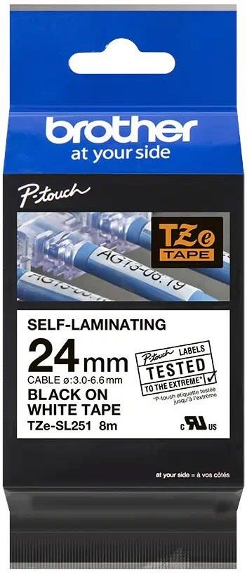 24 mm szerokości, 8 m długości Przeznaczona do identyfikacji kabli o średnicy od 3,0 do 6,6 mm Wysokiej jakości oryginalna taśma firmy Brother Zapewnia wyraźne i trwałe rezultaty Taśma samolaminująca TZe-SL251, czarny nadruk na białym tle, została zaprojektowana z myślą o identyfikacji kabli sieciowych. Ma ona specjalne właściwości, które zapewniają, że etykiety są mocno przymocowane do przewodów i kabli. Kompatybilna z wybranymi modelami urządzeń P-touch, które obsługują taśmy TZe o szerokości 24 mm i 36 mm.   Kompatybilne z Brother  PT-D800W,  PT-E550WVP, PT-P900W, PT-P950NW. Samolaminująca taśma TZe-SL251 o szerokości 24 mm, została zaprojektowana głównie do identyfikacji kabli sieciowych CAT5e / CAT6 / CAT6A o średnicy od 3,0 do 6,6 mm. Dodatkowo przeszła szereg rygorystycznych testów, abyśmy mieli pewność, że drukowanie etykiet identyfikacyjnych będzie szybkie i łatwe. Opracowana przy użyciu specjalnego kleju i materiałów, które umożliwiają łatwe umieszczanie etykiet na kablach, ta czarno-biała taśma Brother TZe-SL251 została zaprojektowana tak, aby pozostawała solidnie przymocowana przez wiele lat. Tekst na etykiecie jest chroniony laminowaną powłoką, która jest automatycznie nakładana podczas drukowania. Ta etykieta o szerokości 24 mm może być owinięta wokół kabli o większej średnicy i nadal będzie zapewniać ochronę tekstu przed ścieraniem i innymi ekstremalnymi czynnikami. Taśma samolaminująca, należąca do serii Brother Pro i jest kompatybilna z wybranymi modelami drukarek etykiet P-touch. Nasze etykiety laminowane zostały opracowane z myślą o trwałości i są w stanie wytrzymać ekstremalne temperatury, światło słoneczne, wodę, chemikalia, ścieranie i nie tylko.