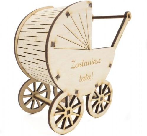 Deku – Wózeczek z grawerunkiem 10x10x5 cm 000217 Drewniany wózeczek z grawerunkiem, to idealny prezent na wszelkie okazje! Baby Shower, Pierwszy roczek, Chrzciny, a z napisem "Zostaniesz tatą" nawet jako zapowiedź nadchodzącego bobasa. Wózeczek jest doskonałą oprawą dla wszelakich, małych upominków i drobiazgów, można w nim ułożyć biżuterię, słodycze, włożyć do niego pieniądze lub pozostawić pusty. Możemy na nim wygrawerować wybrane imię, wzór lub dowolny napis. Wózeczek to gotowy produkt, ale można go również ozdobić na swój własny, unikalny sposób. Można go pomalować farbami lub wykonać Decoupage. specyfikacja: wymiary: szerokość: 10 cm, wysokość: 10 cm, głębokość: 5 cm Wózeczek wykonany jest ze sklejki brzozowej o grubości 3 mm