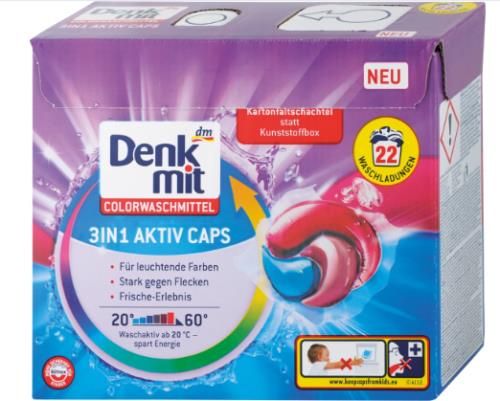 Denkmit Kapsułki do prania KOLOR 3w1 Aktiv Caps, 594g, 22szt Działają już w 20°C Skuteczne usuwanie plam Dla lśniących kolorów Nadają praniu uczucie świeżości Kapsułki do kolorowego prania 3w1 Aktiv Caps marki Denkmit zapewniają skuteczne i intensywne czyszczenie kolorowych tekstyliów. Kapsułki nie tylko rozpuszczają plamy, ale również otulają pranie świeżym zapachem. Umieść kapsułkę w pustym bębnie. Następnie włóż pranie. Po każdym wyjęciu kapsułki szczelnie zamknij opakowanie. Nie należy otwierać ani przebijać folii z detergentem. Dotykaj kapsułkę wyłącznie suchymi dłońmi, a następnie dokładnie umyj ręce. Kapsułki nie nadają się do prania wełny i jedwabiu. KRAJ POCHODZENIA: HOLANDIA OSTRZEŻENIA Przechowuj szczelnie zamknięte w miejscu poza zasięgiem dzieci. Chronić przed działaniem niskich temperatur! Kolor produktu może ulec zmianie z powodu działania światła słonecznego. UWAGA! Działa drażniąco na skórę. Działa drażniąco na oczy. Działa szkodliwie na organizmy wodne, powodując długotrwałe skutki. W razie konieczności zasięgnięcia porady lekarza należy pokazać pojemnik lub etykietę. Chronić przed dziećmi. W PRZYPADKU DOSTANIA SIĘ DO OCZU: Ostrożnie płukać wodą przez kilka minut. Wyjąć soczewki kontaktowe, jeżeli są i można je łatwo usunąć. Nadal płukać. W przypadku utrzymywania się działania drażniącego na oczy: Zasięgnąć porady/zgłosić się pod opiekę lekarza. SKLADNIKI: 15-30% anionowe środki powierzchniowo-czynne, mydło, niejonowe środki powierzchniowo-czynne. Mniej niż 5% fosforany Zawierają enzymy (proteaza, lipaza, amylaza, celulaza, mannaza), kompozycje zapachowe (LIMONENE, BENZYL ALCOHOL, LINALOOL), PHENOXYETHANOL, BENZISOTHIAZOLINONE. Pozostałe składniki: barwniki, Bitrex.
