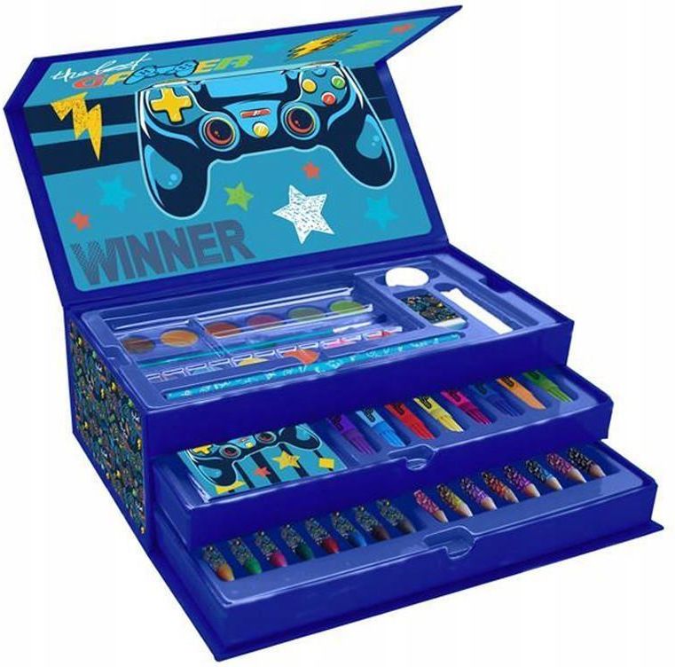 Zestaw artystyczny w kuferku Gamer Diakakis 185585468 Zestaw przyborów dla małego artysty zapakowany w ozdobne pudełko-kuferek. Posiada rączkę do wygodnego przenoszenia i dwie wysuwane szufladki. Kuferek zapianany jest na 2 rzepy. Zestaw zawiera: 8 kredek ołówkowych, 8 kredek świecowych, 8 pisaków, …