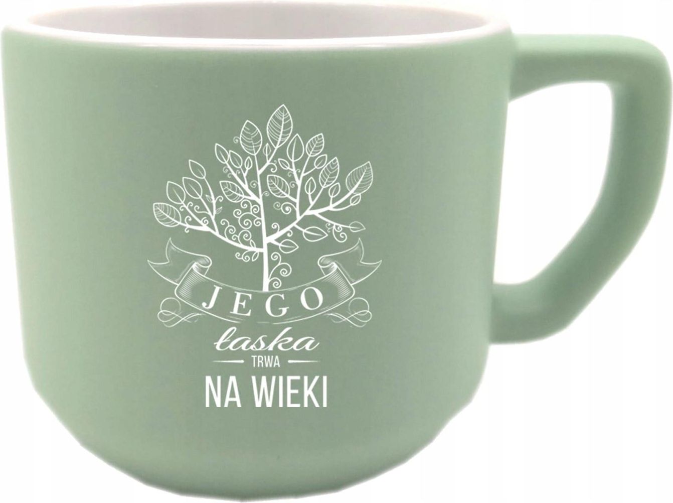 EmiMors Kubek beczka w kolorze zielonym Kształt: beczka Napis: "Jego łaska trwa na wieki" Specyfikacja: Wysokość: 78 mm Średnica górna/dolna: 80/70 mm Pojemność: 360 ml. Kolor wypełnienia: biały Tworzywo: ceramika Fason: zwężany u dołu Mycie w zmywarce: Nie Kolor: Zielony Ze względu na technikę nadruku nie zaleca się mycia w zmywarkach.