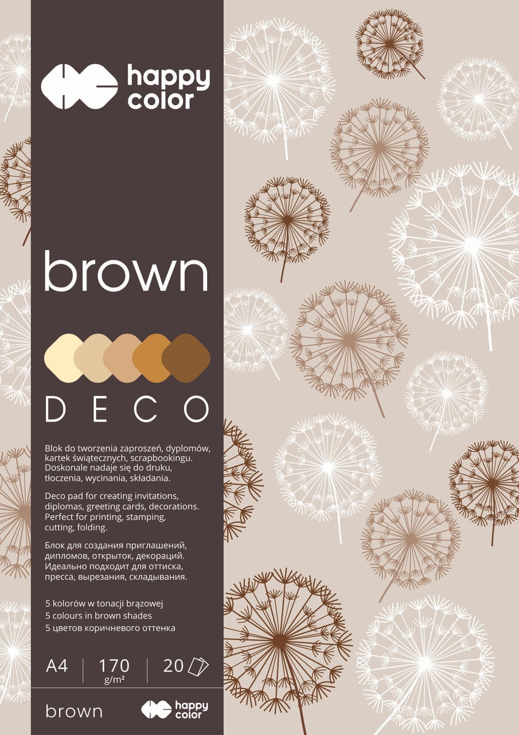 Blok techniczny A4 Happy Color BROWN Blok Deco Brown A4 Happy Color Papier barwiony w masie, daje kolorowe krawędzie przy wycinaniu i składaniu . Blok do tworzenia tematycznych dekoracji. Doskonały do tworzenia laurek, zaproszeń, kartek okolicznościowych, scrapbookingu. Do tworzenia oryginalnych prac plastycznych . Polecany dla dzieci w szkole i przedszkolu . Format – A4 Ilość kartek – 20 Gramatura papieru – 170 g/m2 5 odcieni koloru brązowego Happy Color to rozpoznawalna na rynku polskim marka wysokiej jakości produktów szkolnych i kreatywnych. Aktualnie Happy color to cała gama produktów do tworzenia dla osób kreatywnych w każdym wieku: dla przedszkolaków, uczniów, studentów, hobbistów.