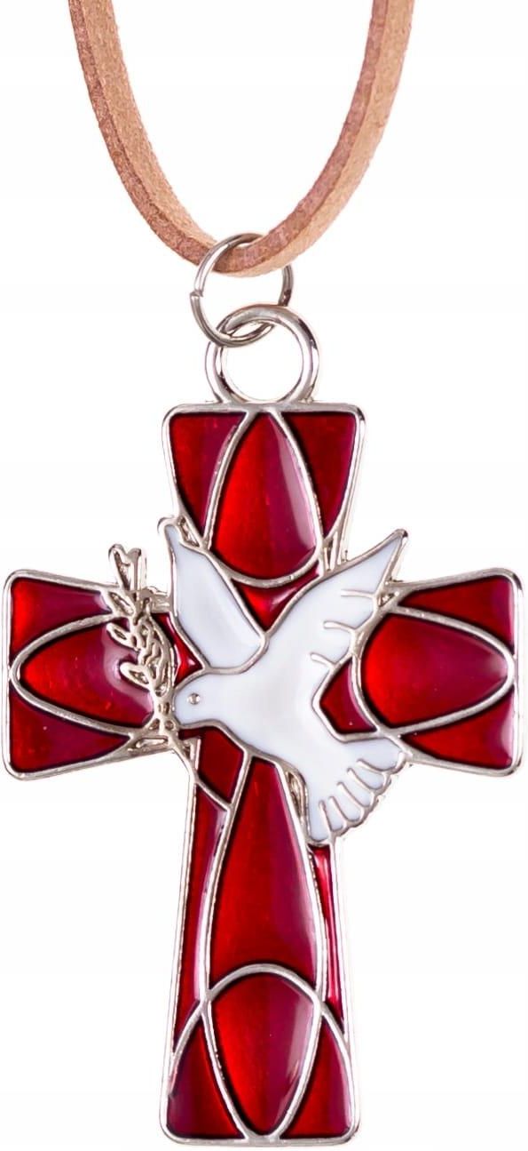 Metalowy krzyżyk - wysokość 5,5 cm - z motywem Ducha Świętego, w zestawie z rzemykiem, do zawieszenia na szyi. Polecany m.in. jako Pamiątka Bierzmowania. Wymiary 3,5 cm x 5,5 cm.