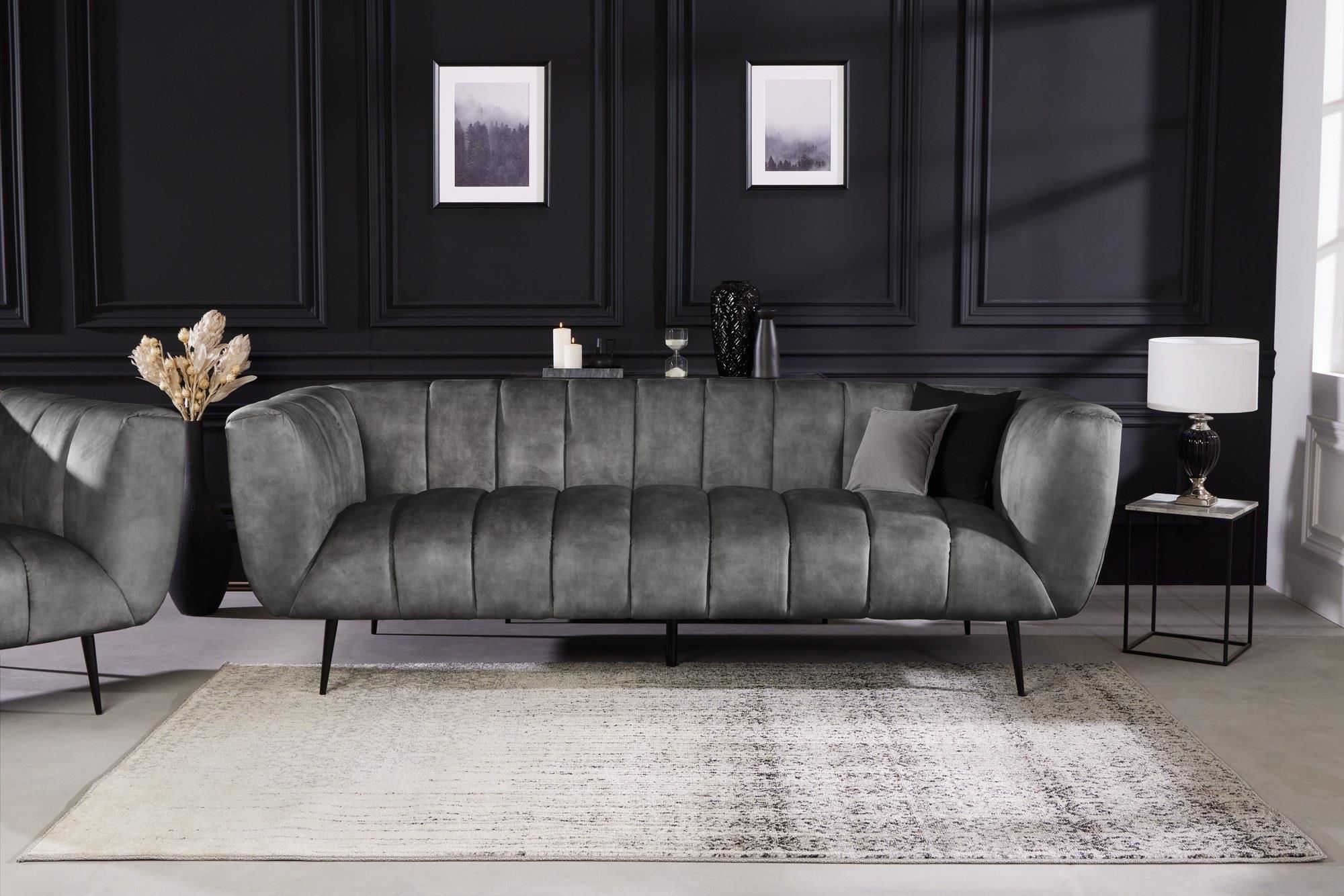 SOFA NOBLESSE 225X90CM WELUR CIEMNOSZARY Ta nowoczesna sofa NOBLESSE to funkcjonalne i praktyczne rozwiązanie pasujące do stylowego salonu. Siedzisko wraz z oparciem obito modną aksamitną tkaniną w kolorze ciemnoszarym z pięknym stylowym wykończeniem wewnątrz mebla. Dzięki zastosowaniu dekoracyjnych pionowych przeszyć całość mebla nabiera niezwykłej elegancji. Osadzona została na stabilnej podstawie składającej się z czterech smukłych metalowych nóg w kolorze czarnym. Prezentowany mebel wykonany jest z wysokiej jakości materiałów zapewniając tym samym wygodne miejsce do siedzenia. Dodatkowym atutem sofy bez wątpienia jest stylowy wygląd oraz zaokrąglone kształty, które od razu podkreślają jej wyjątkowy charakter. Mebel ten posiada doskonale wyprofilowane oparcie oraz siedzisko zaprojektowane w taki sposób aby odpowiednio wspierało sylwetkę siedzącego. Ponadto charakterystyczną jej cechą jest zastosowanie bardzo modnych i zarazem oryginalnych krzywizn na oparciu oraz podłokietnikach. Efekt końcowy połączenia ciemnoszarego korpusu siedziska wraz z czarną metalową podstawą jest fenomenalny nadający całości niezwykle wyjątkowego designu. NOBLESSE idealnie sprawdzi się w salonach urządzonych w stylu nowoczesnym gdzie stanie się nie tylko funkcjonalnym meblem, ale także przepiękną dekoracją, która doda wnętrzu unikatowego wykończenia i niesamowitego wyglądu. W serii NOBLESSE występują również inne fotele oraz sofy w różnych kolorach oraz wymiarach- patrz produkty powiązane. Velvet to ekskluzywna tkanina obiciowa o wyjątkowych właściwościach. Intensywność i odcień koloru mogą się zmieniać, a na powierzchni mogą pojawiać się subtelne, niepowtarzalne wzory, zależne od kierunku ułożenia włókien i kąta padania światła. W efekcie każdy mebel zyskuje indywidualny charakter, stając się eleganckim, przyciągającym wzrok elementem wnętrza. Prosimy jednak pamiętać, że odcień tkaniny może różnić się od widocznego na zdjęciach poglądowych. Invicta Interior to niezawodny dostawca ekskluzywnych designerskich mebli i akcesoriów domowych. Jest to dynamiczna i doświadczona firma z wieloletnimi międzynarodowymi kontaktami i stale poszukującą nowych produktów i innowacyjnych pomysłów. Dojrzała ogólna koncepcja firmy pozwala zaoferować klientom duży wybór nowoczesnych i klasycznych mebli o wyjątkowej jakości w rozsądnych cenach. Invicta Interior monitoruje wszystkie aktualne trendy w branży meblowej, dlatego klienci zawsze otrzymują najnowsze i najwyższej jakości designerskie meble.