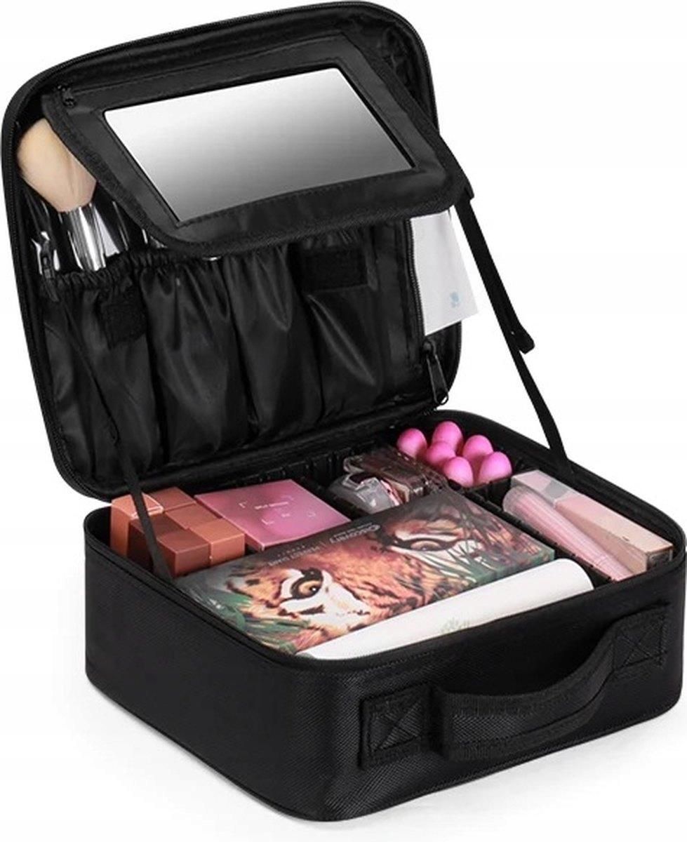 Kosmetyczka kuferek organizer etui na kosmetyki z lustrem DUŻY Liczne kieszonki i przesuwane przegrody etui, pozwolą na pomieszczenie dużej ilości kosmetyków i przyborów do makijażu. Etui posiada 2 kieszonki zamykane na podwójny zamek błyskawiczny oraz rączkę, która znacznie ułatwia przechowywanie i przenoszenie. Etui posiada dodatkowo uchwyt na rączkę walizki i pasek, który pozwala nosić kuferek jako plecak lub torbę na ramię. W środku głównej komory znajdują się liczne przegrody, które można przestawiać według własnych potrzeb. Na górnej klapie kuferka znajdują się przegródki na przybory do makijażu oraz kieszeń. Na klapie oddzielającej główną komorę i klapę znajduje się lusterko o wymiarach 17,5x9cm. Lusterko można wyciągnąć z kieszonki w której się znajduje. Pokrywa od kuferka dzięki odczepianym paskom po bokach może otwierać się całkowicie lub po zaczepieniu pasków, może zatrzymywać się u góry. Dodatkowa komora dzięki 5 gumom na środku pozwala przewozić np. Najważniejsze cechy produktu: Wykonany z wysokiej jakości usztywnionego materiału Amortyzuje wstrząsy, uderzenia i upadki Posiada wygodną rączkę oraz pasek do przenoszenia Specjalna konstrukcja przegródek, pozwala na zmianę ich wielkości wedle naszych potrzeb 12 przegródek na pędzelki etc, odgrodzone od głównej komory klapą na rzepy na której jest lusterko, zapobiega np. ubrudzeniom reszty kosmetyków Kieszeń w górnej klapie etui na drobiazgi lub płaskie akcesoria jak paleta cieni, lusterko Dodatkowo kieszeń na górze pozwala na transport dodatkowych płaskich przedmiotów jak lokówka. W środku znajduje się 5 gum do których można wsunąć podłużne przedmioty Sztywna konstrukcja Wymiary zewnętrzne etui: 25,5 x 23 x 9,5 cm Kolor czarny